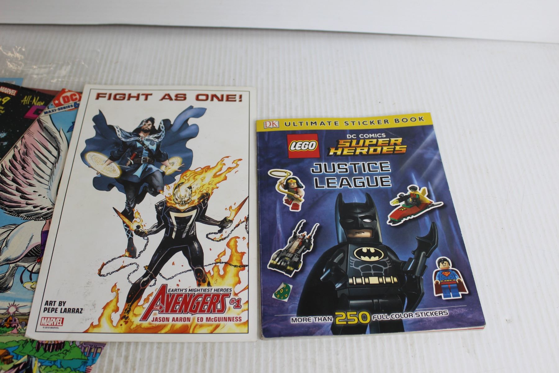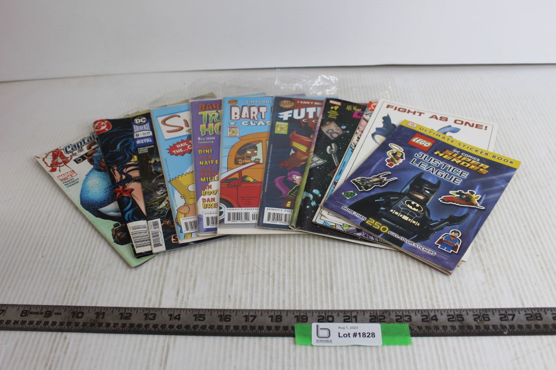 (9) Misc. Comics (The Simpsons, Futurama, Marvel, DC, Wonder Woman [Cover Separates From Comic]), The Avengers Magazine Pullout, Lego Justice League Sticker Book (Some Stickers Not Used)