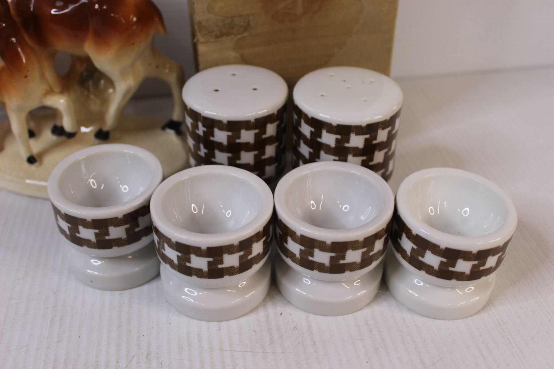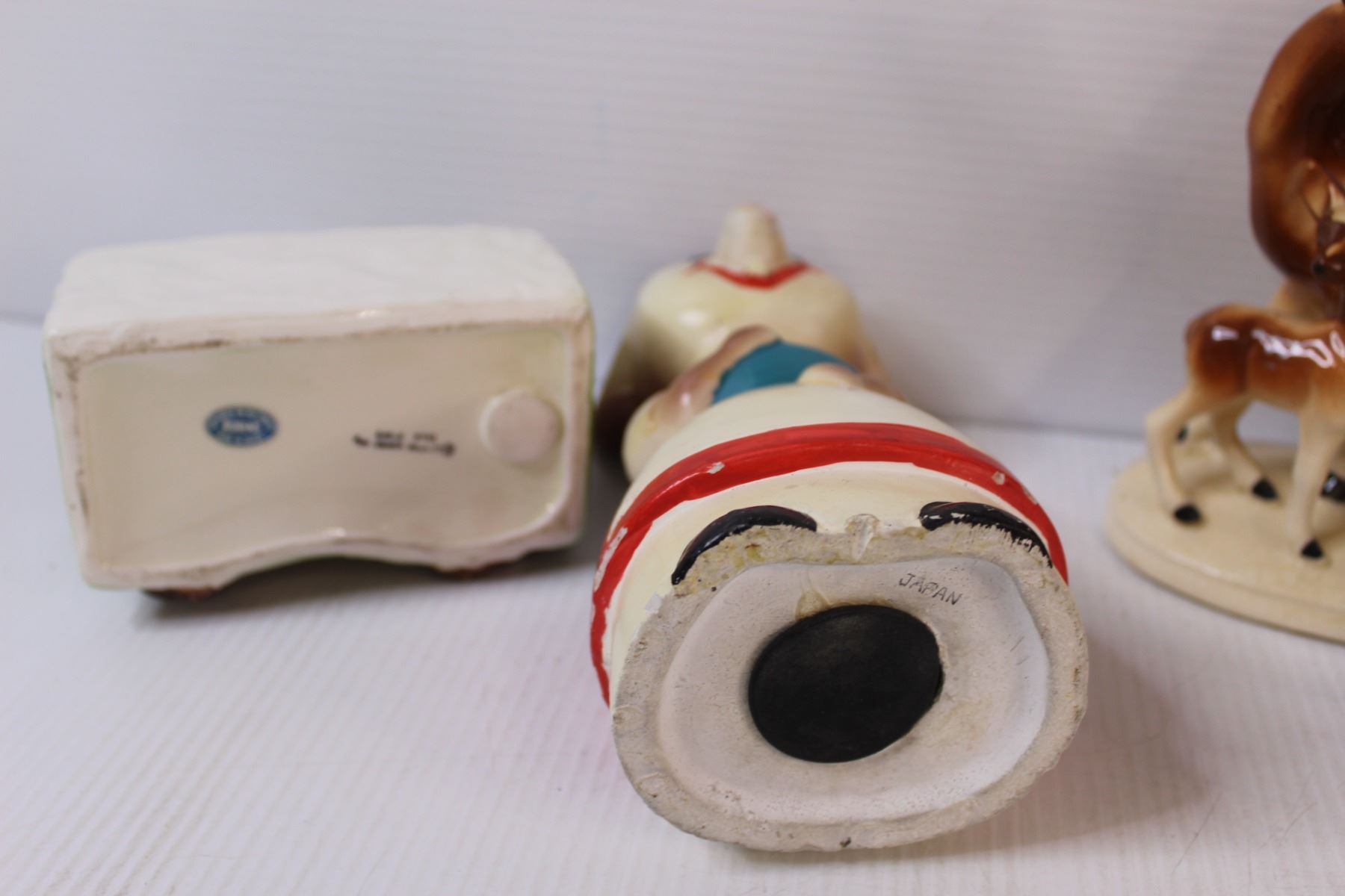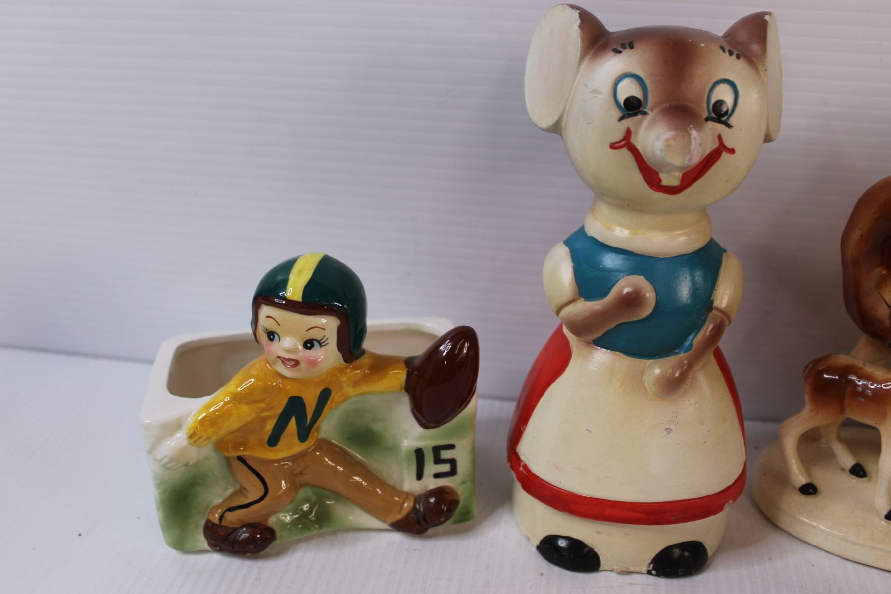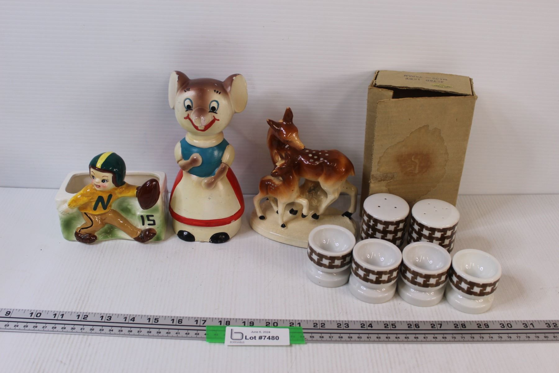 (9) Misc. Ornaments Made in Japan: Mouse Bank, Deer; Football Player; Egg Set