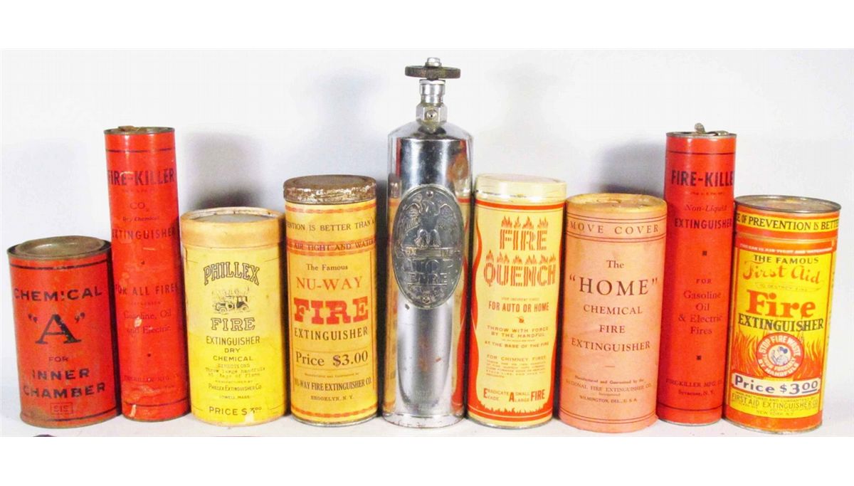 Collection of 9 Miscellaneous Chemical Fire Extinguishers including Fire Quench, Fire Killer, First Aide and Nu-Way. Various sizes and conditions.