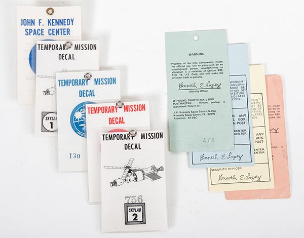 9 Nasa Mission Badges – Gemini, Skylab and Shuttle. A complete set of 4 Skylab mission badges. All encased in plastic with a ringlet in the top center. The Gemini 12 (the final Gemini mission) badge is similar to the Skylab badges but with a clip attached. 4 Shuttle "SUPPORT" passes are for STS 4 through 7 and each is in different color / made of paper. (The STS-4 pass is a bit wrinkled.) A nice selection.