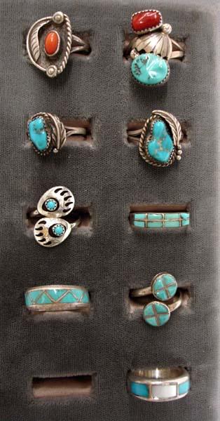 9 Navajo Silver Turquoise Coral Rings. The largest ring size in the group is size 10. The ring with the turquoise and coral setting is 5/8''x3/8''. Buyers Pay Actual Shipping and Handling Charges(see terms and conditions for more information).