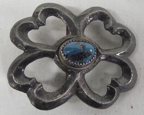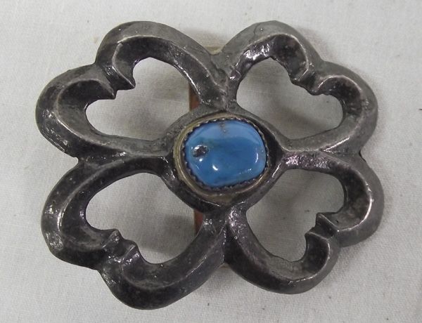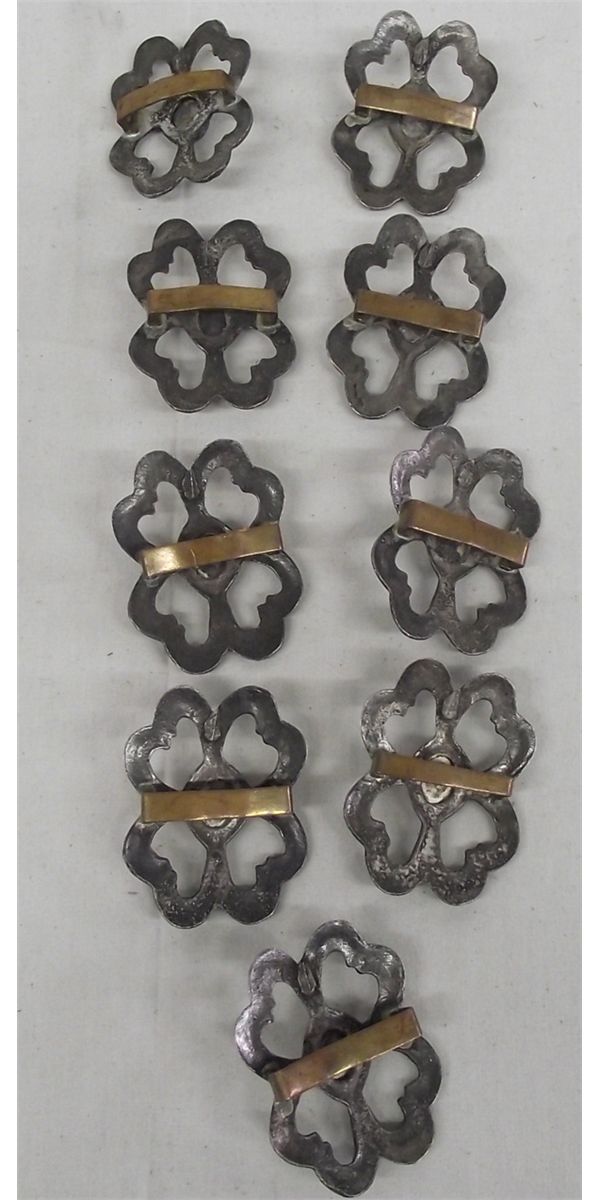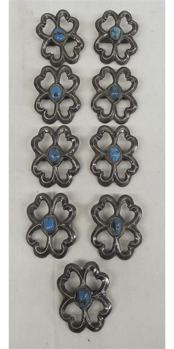 9 Navajo Sterling & Turquoise Sandcast Conchos. Each concho is set with an oval stone in its center. The largest measures approx. 2'' x 1.75''.