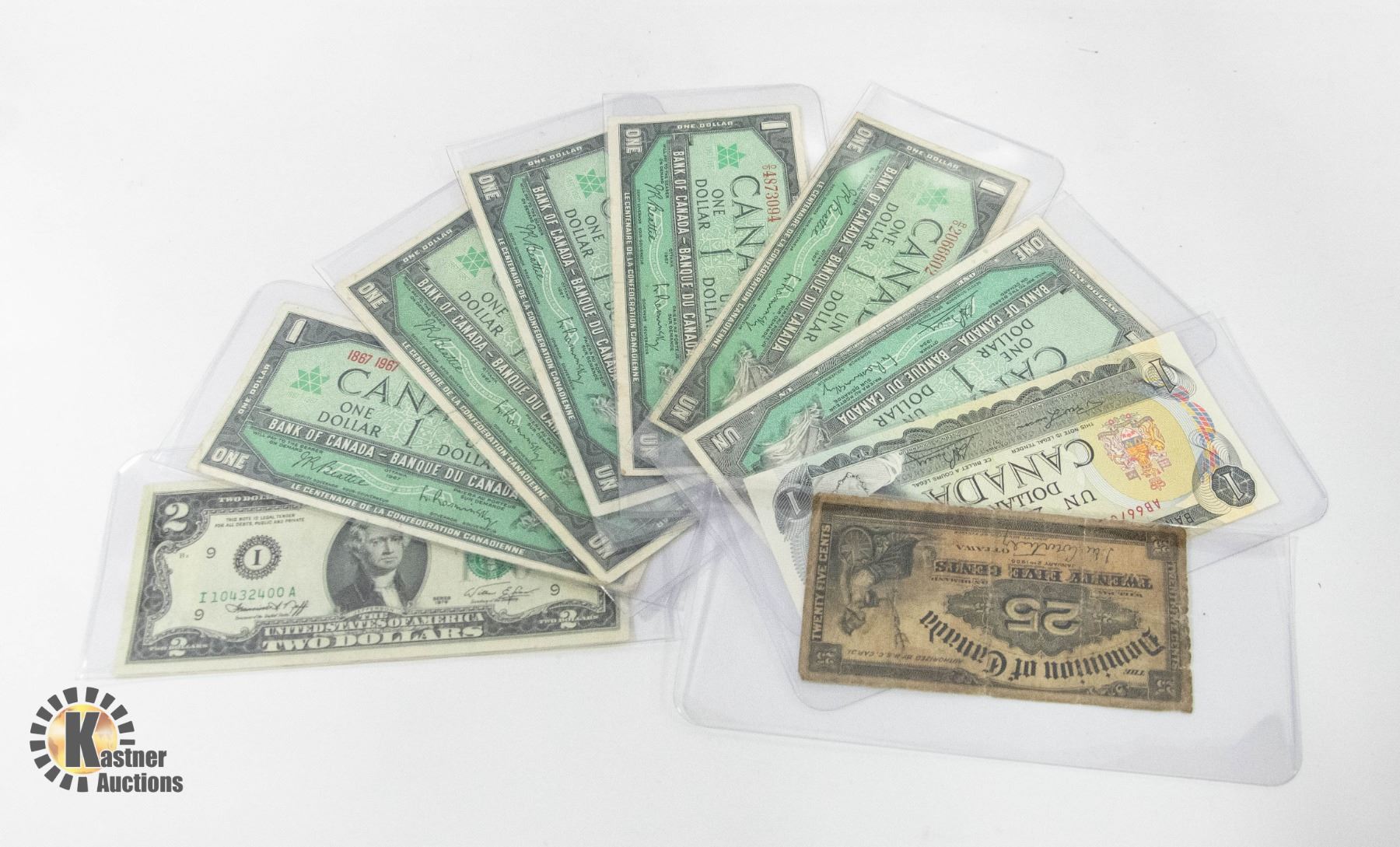 9 OLD VARIOUS CANADA + USA BANKNOTES 1900-1976