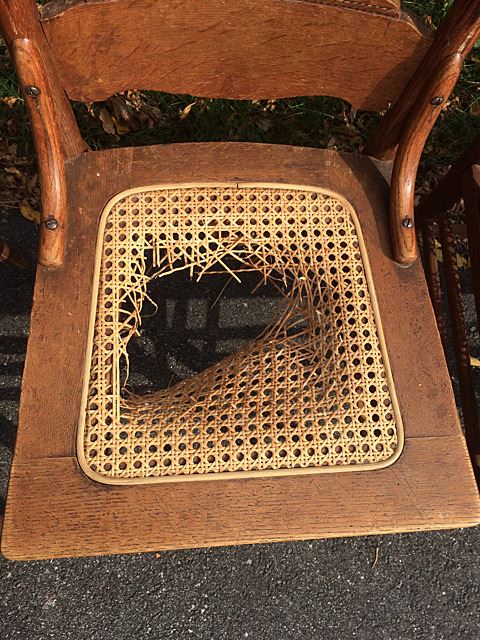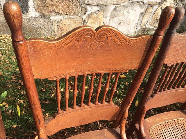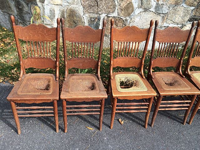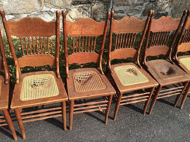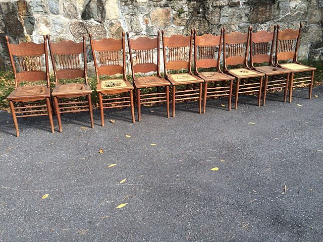 9 matching press back oak chairs with spindel backs. Beautiful set of 9 oak chairs, recane and enjoy in time for the Holidays!!!