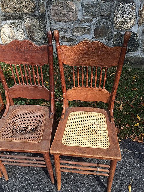 9 matching press back oak chairs with spindel backs. Beautiful set of 9 oak chairs, recane and enjoy in time for the Holidays!!!