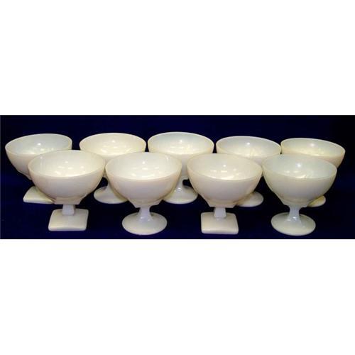 9 Opalescent Glass Dessert Compotes, 3 square 6 round bases. SIZE: 5" h 5 1/2" d. CONDITION: Very good.