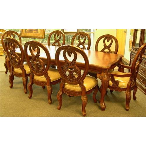 9 Piece Super Quality 8 FT Dining Room / Conference Table & 8 Chairs constructed from solid hard woods, cherry & natural burl veneers. The table top stands strong and sturdy on four carved legs and it is finished with semi gloss cherry finish. The table surface is immaculate and smooth with perfect color tones and uniform wood grains; you should see the beauty of the cross banding of the Cherry & Natural Burl Veneer.
