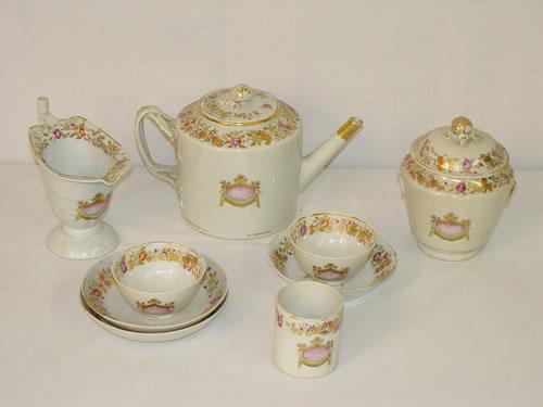 9 PC. ORIENTAL EXPORT TEA SET W/ AMORIAL DECORATION & GOLD & FLORAL HIGHLIGHTS: TEAPOT, SUGAR & CREAMER, MUG, (3) SAUCERS, & (2) HANDLELESS CUPS - WEAR & IMPERFECTIONS