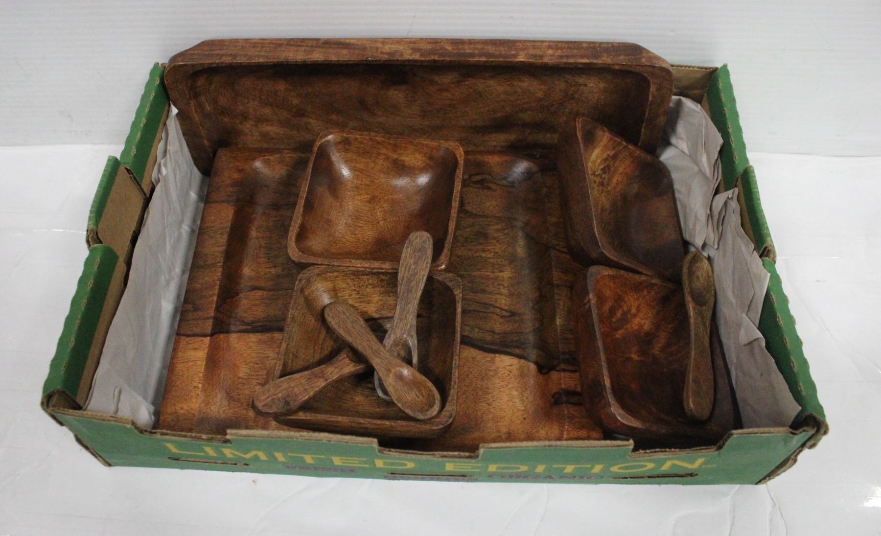 9 PC WOODEN NUT DISH W/4 BOWLS, 4 SPOONS AND EXTRA
