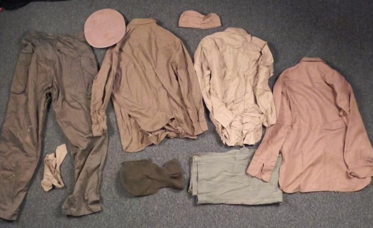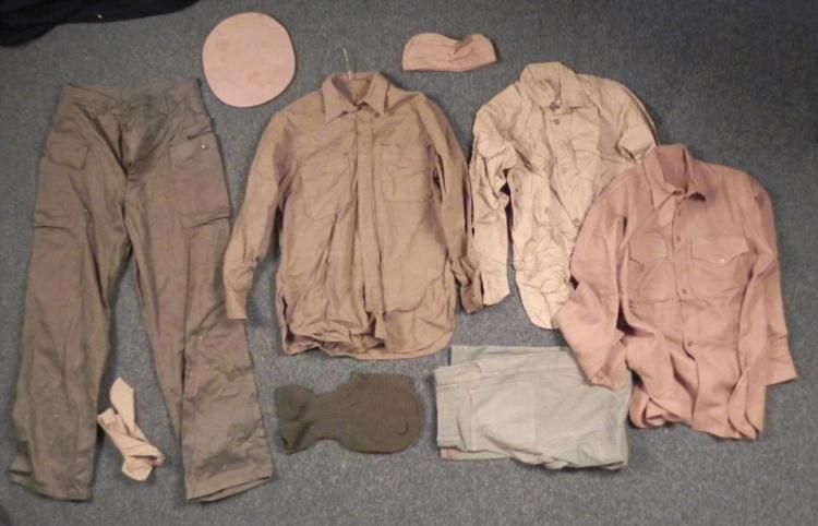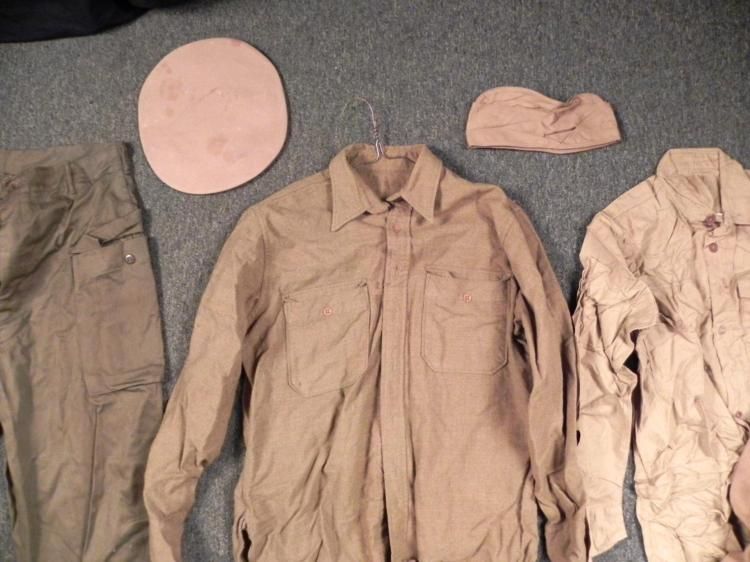 9 PIECE GROUPING OF WWII ARMY UNIFORM CLOTHING--ALL ORIGINAL INCLUDES--TIE-KNIT WINTER FACE HOOD-VISOR CAP TOP-TAN SUMMER SHIRT-OVERSEAS CAP-WORK PANTS-2 WOOL SHIRTS-1 PANTS-NICE ORIGINAL WWIIUS GROUPING