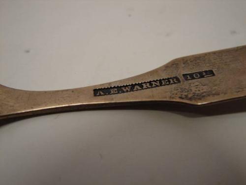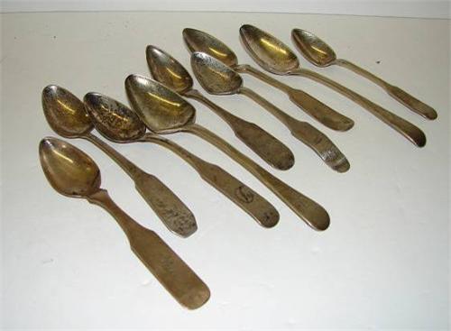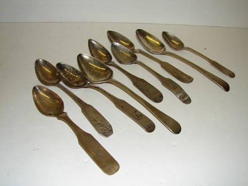 9 PIECE LOT OF COIN SILVER TEASPOONS. Various manufacturers including P. Garrett, J.R. Lage, A.E. Warner and E. Wyer. Condition ranges from excellent to poor.