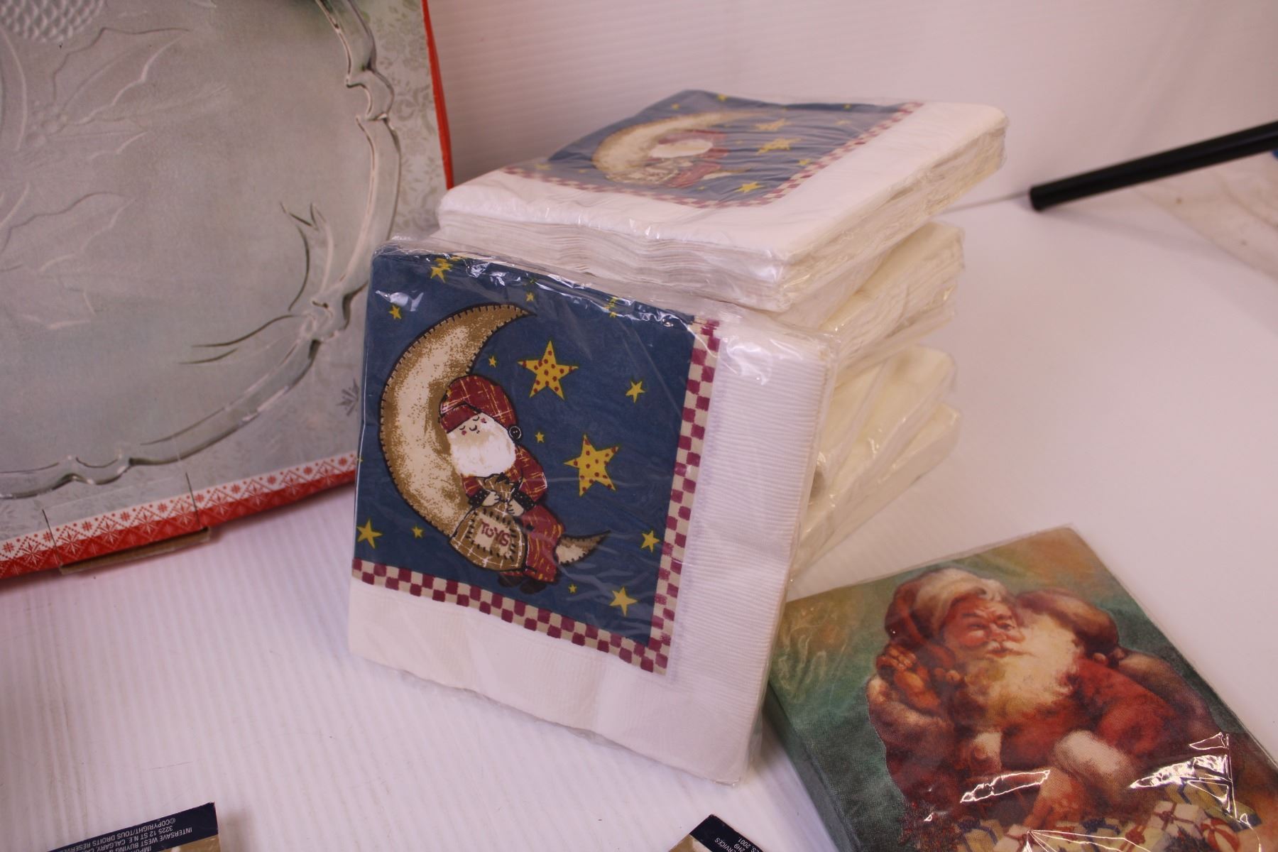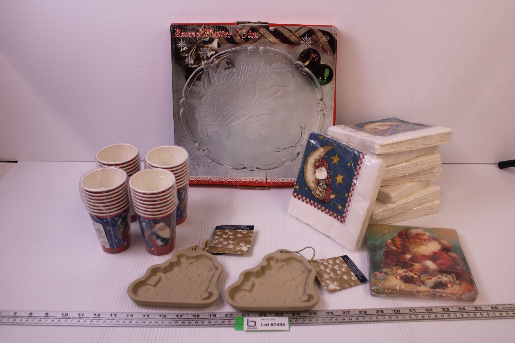 (9) Packages of Christmas Napkins, (4) Packages of Christmas Paper Cups, 13” Round Christmas Platter