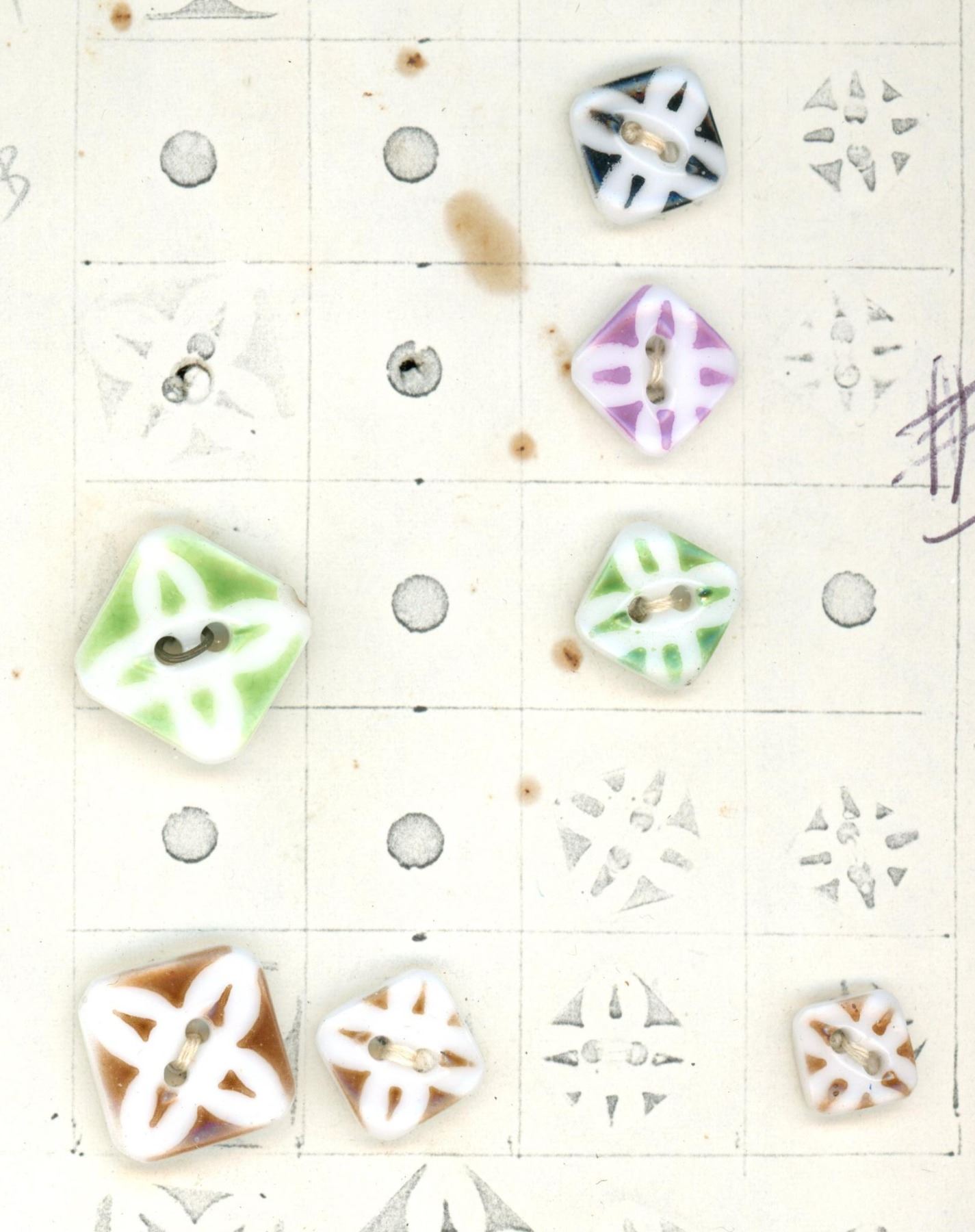 138 Small early 20th century mostly china stencil examples. From the collection of the late Dorothy Peterson of Virginia and a member of the Martha Washington Button Club. Although this lot includes a few non stencil chian examples the lot is mostly stencil examples in a variety of colors and patterns. Look closely as this is a large selection of these.