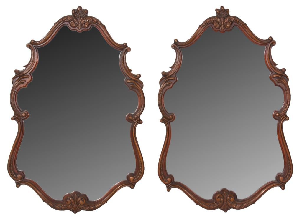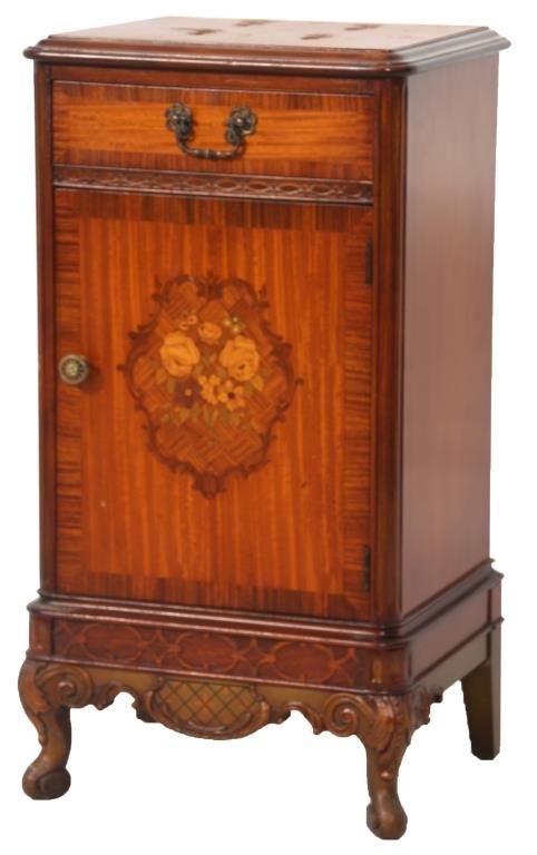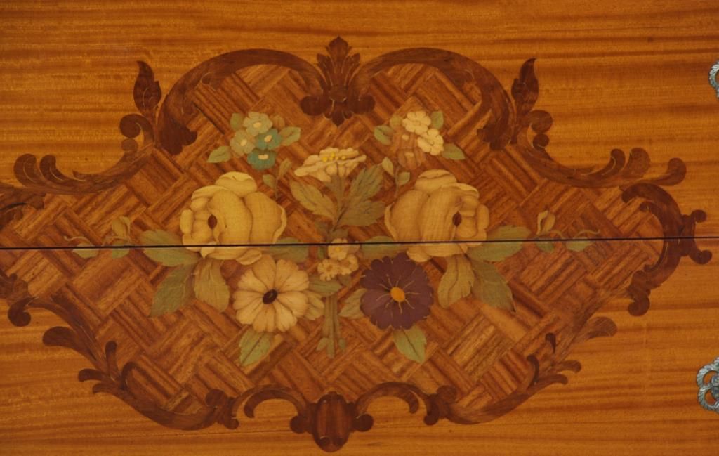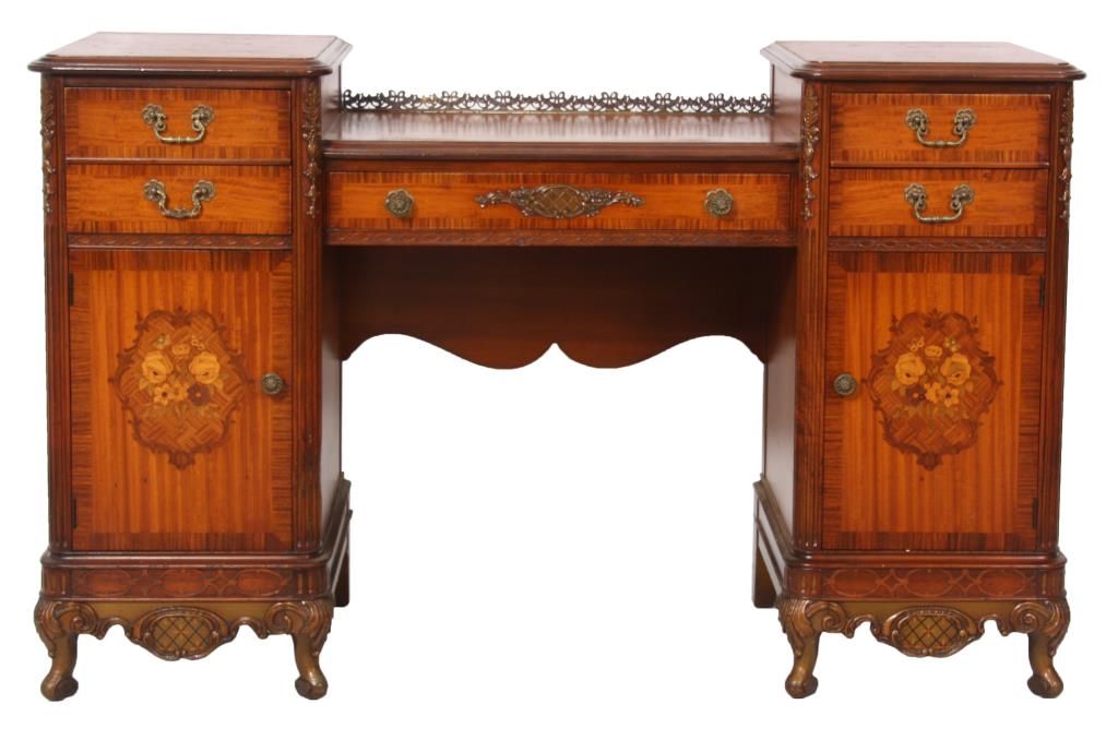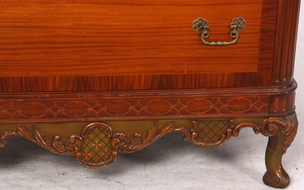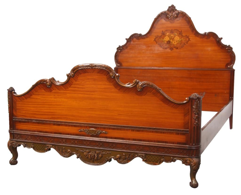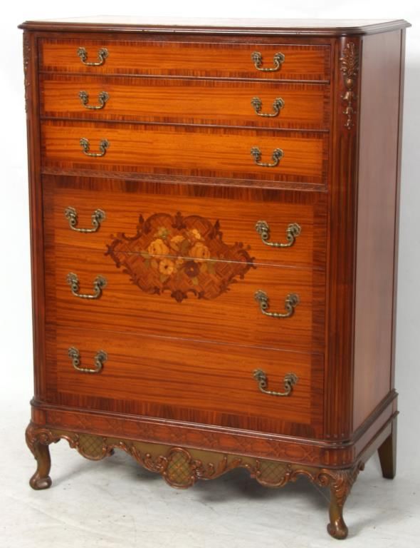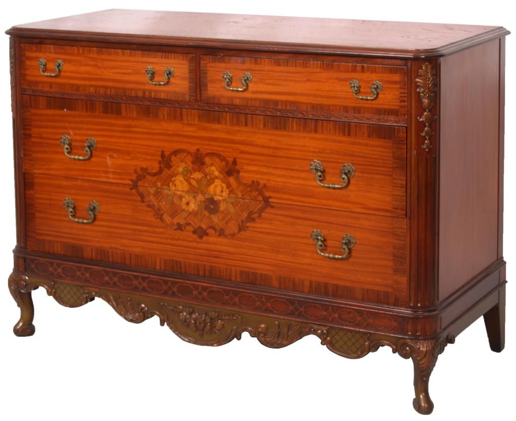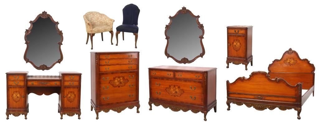 9 Pc. Inlaid Mahogany Bedroom Set. The set has beautiful inlaid floral clusters with roses on the front of the dressers, brass pulls and scroll carved cabriole legs; rounded corners with fluted carvings on the front and gilt carved filigree above. Set includes a full size bed, 55.5 in. high x 56.25 in. wide x 80 in. long; double bank vanity, 33 in. high x 52.5 in. wide x 18 in. deep; 6 drawer chest, 52 in. high x 38 in. wide x 20 in. deep; 2 over 2 drawer chest, 36 in. high x 52 in. wide x 22 in. deep; half commode, 28.5 in. high x15 in. wide x 12.25 in. deep; 2 wall mirrors, 43 in. high x 31 in. deep; vanity chair and boudoir chair. Set is in very good condition and original finish; circa 1920.