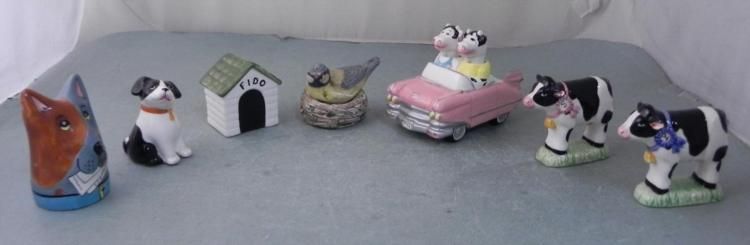 This is a fun group of animal salt & pepper shakers. They are ceramic, with fine colors. All are in very good condition, ready to use or display with a collection. * Included are: * * Fido and his dog house * A dog's head, holding a newspaper * Two standing cows from Midwest Importers * Two cows in a pink Cadillac, with removable heads as the shakers, by Clay Art * Bird in a nest of eggs, with nest as a shaker too, by Baskin * * * These are sure to bring some charm to your kitchen.