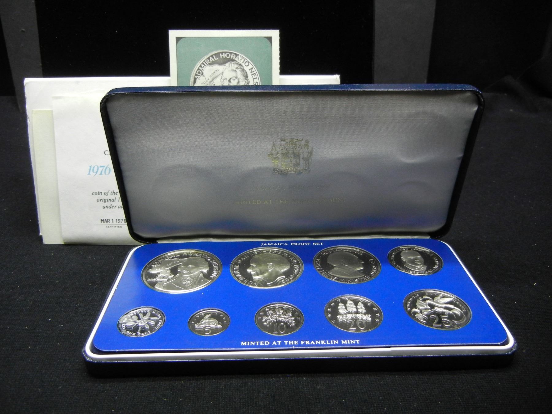 (9) Piece 1976 Jamaica Proof Set. $10 and $5 coins are silver (almost two ounces). Beautiful set in original government package. GEM.