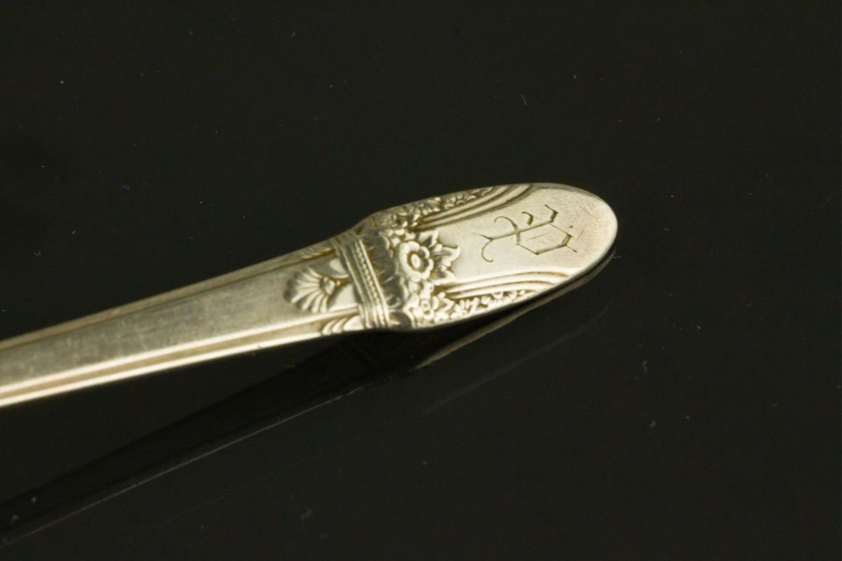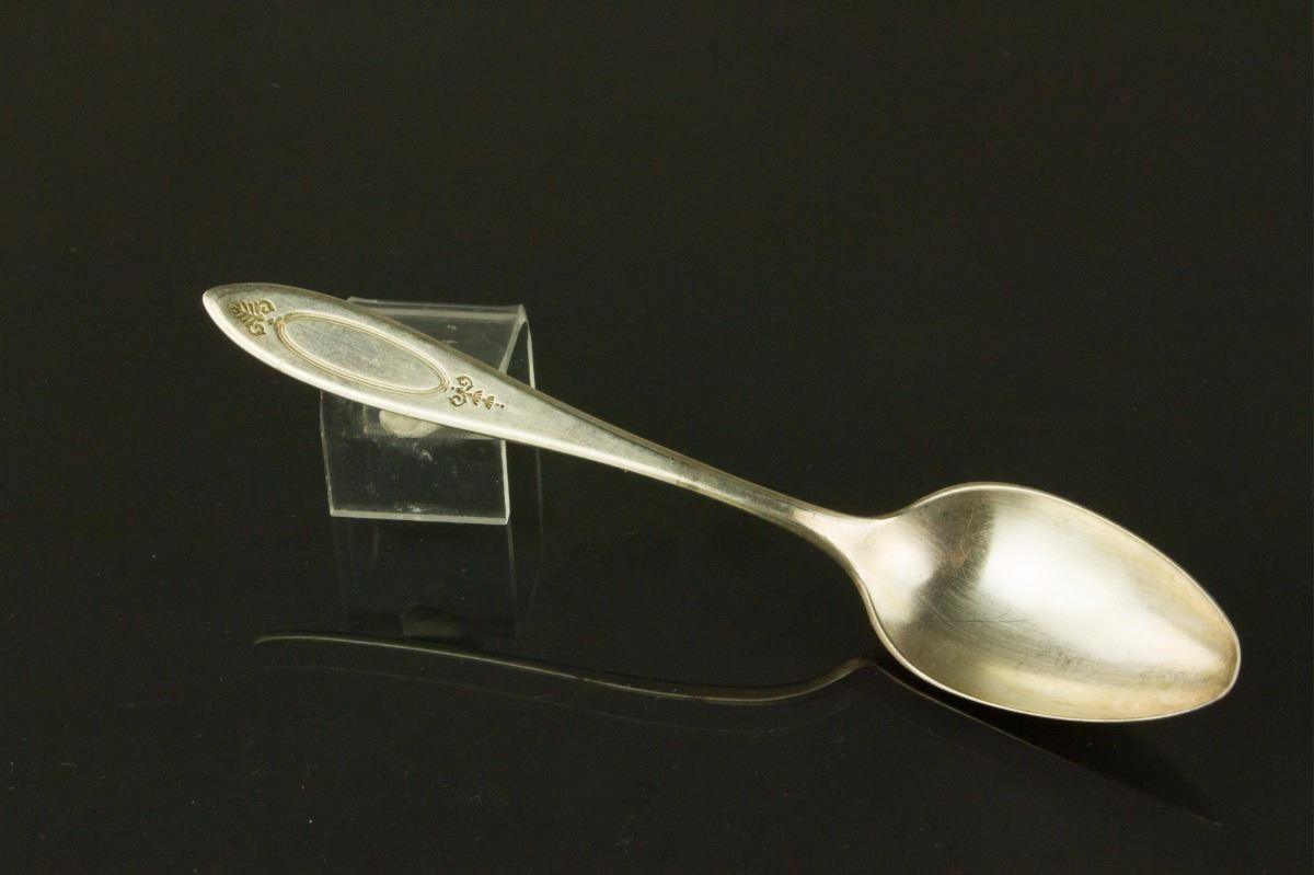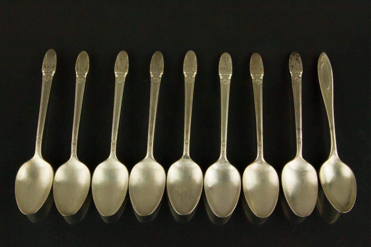 Nine pieces of silver spoons; all with engravings on handles; W: 3 cm, L: 16 cm, 246 grams