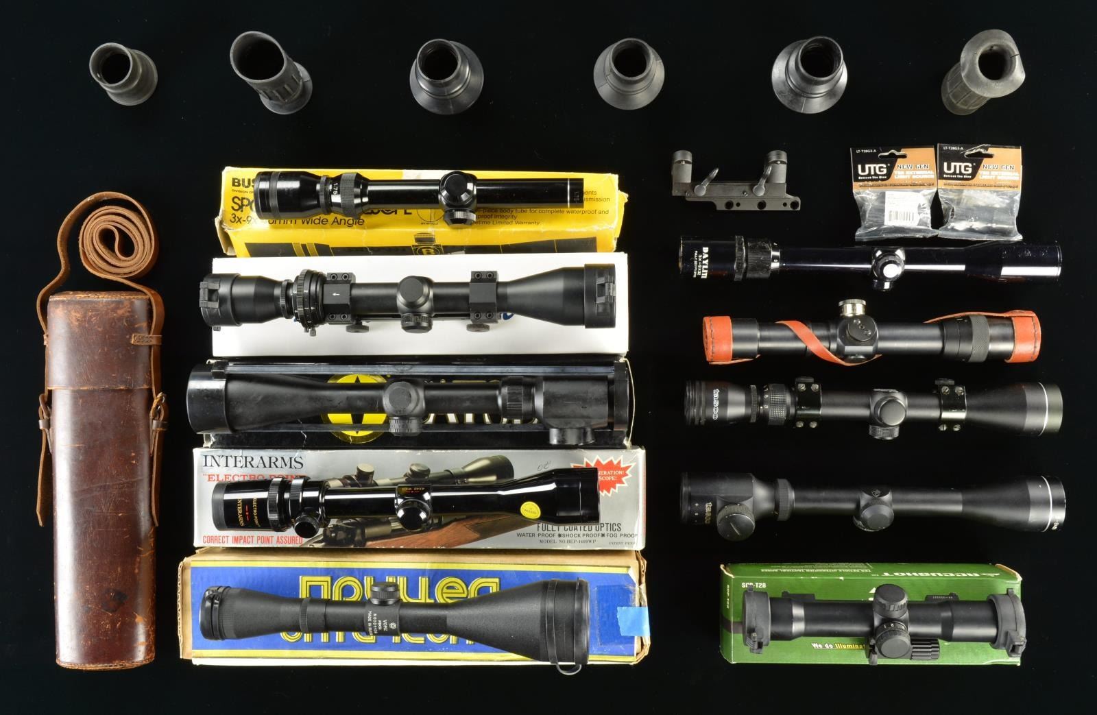 9) Leapers (Accushot) T28 reticle Intensified Tactical scope. STANAG style mt., flip up lens caps plus external light source. 2 spare UTG light sources utilizing button style batteries.