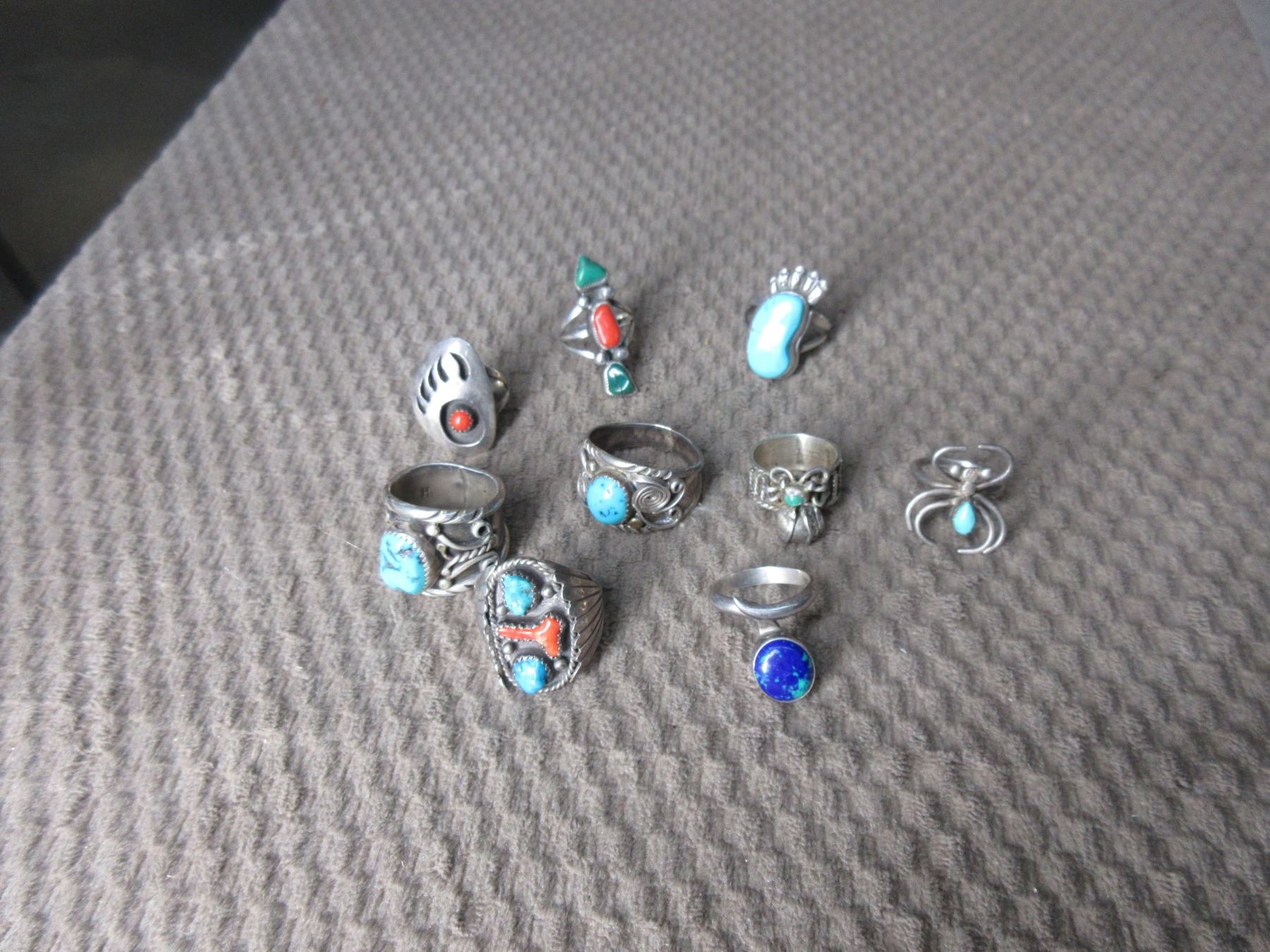 9 - Silver & Turquoise Rings - 3 stamped sterling, 3 stamped H, 3 with no stamp, total weight is approximately 58 grams