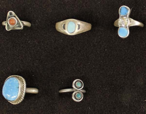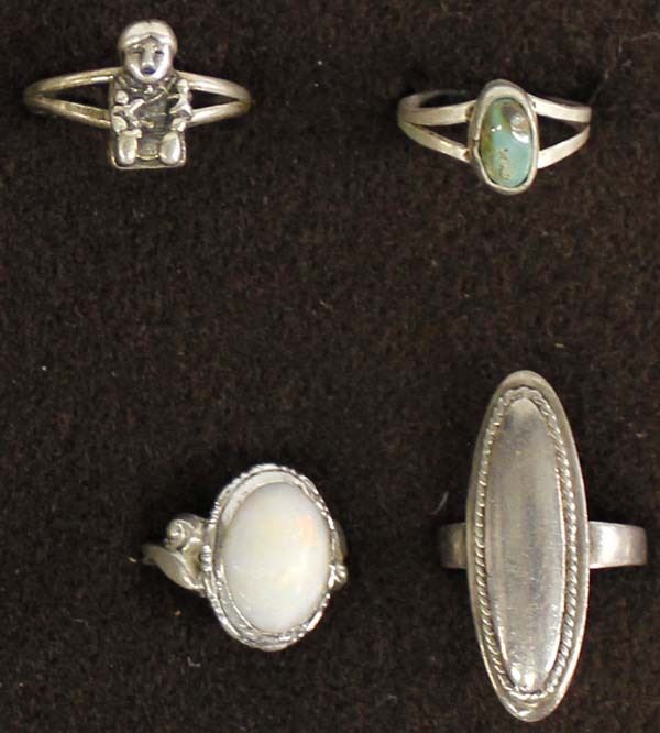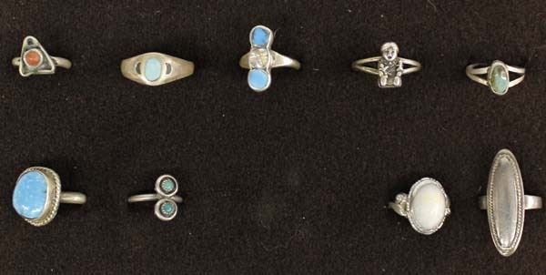 9 Sterling Silver Rings, Some Native American, 1) Navajo Sterling Ring, Size 8.25 2) Opal Ring, Size 6 3) Navao Turquoise Ring, Size 6 4) Navajo Turquoise Ring, Size 5 5) Navajo Turquoise Ring, Size 5 6) Storyteller Ring, Size 7.75 7) Navajo Turquoise and Abalone Ring, Size 5 8) Turquoise Ring, Size 8.5 and 9) Navajo Coral Ring, Size 4.5
