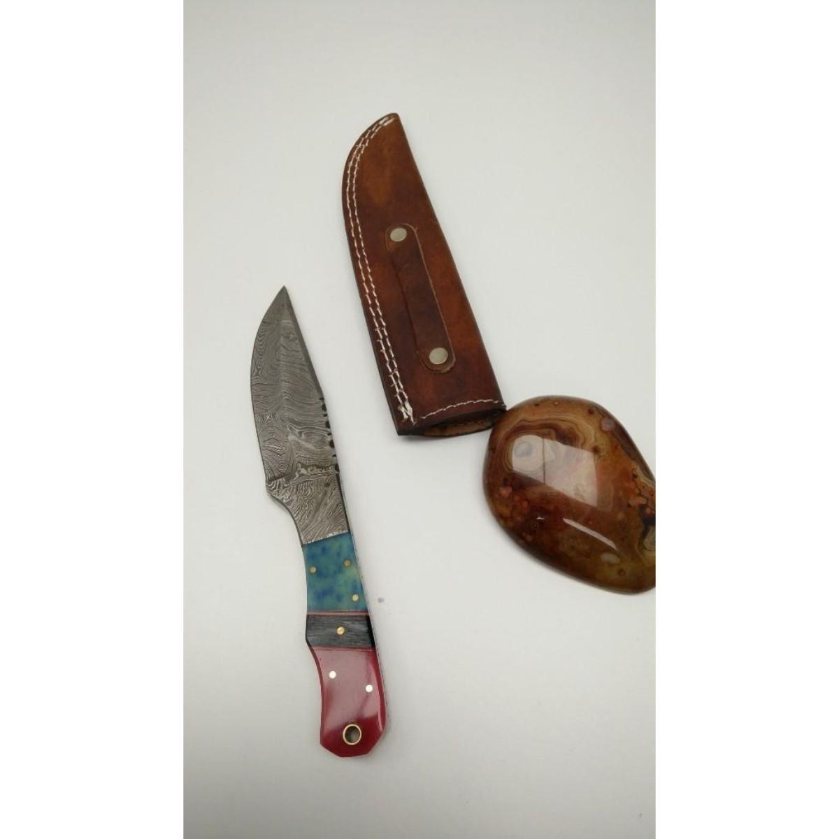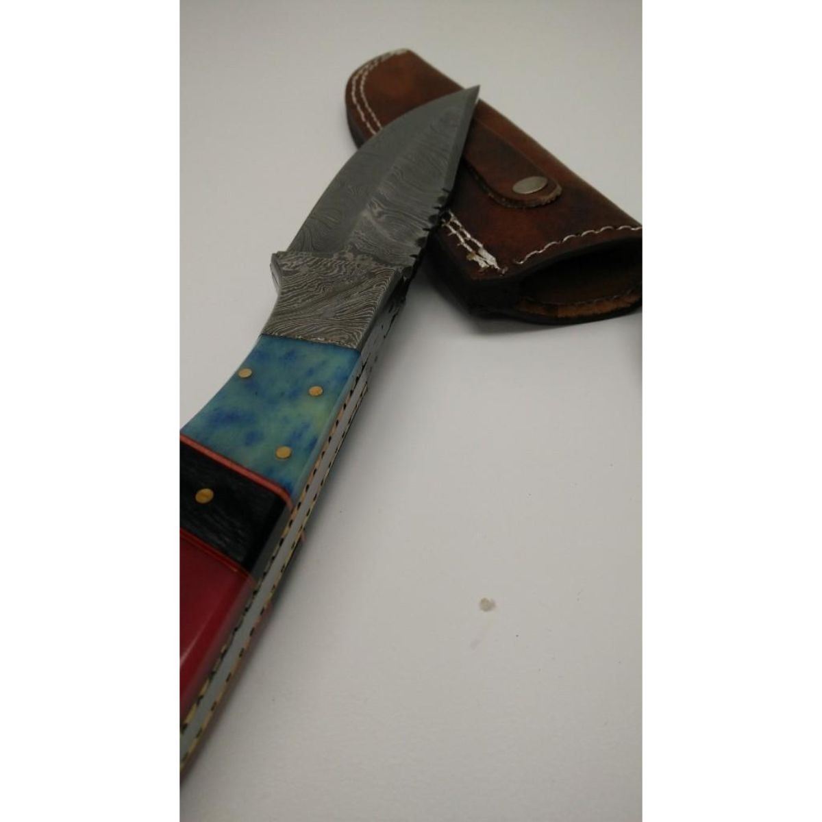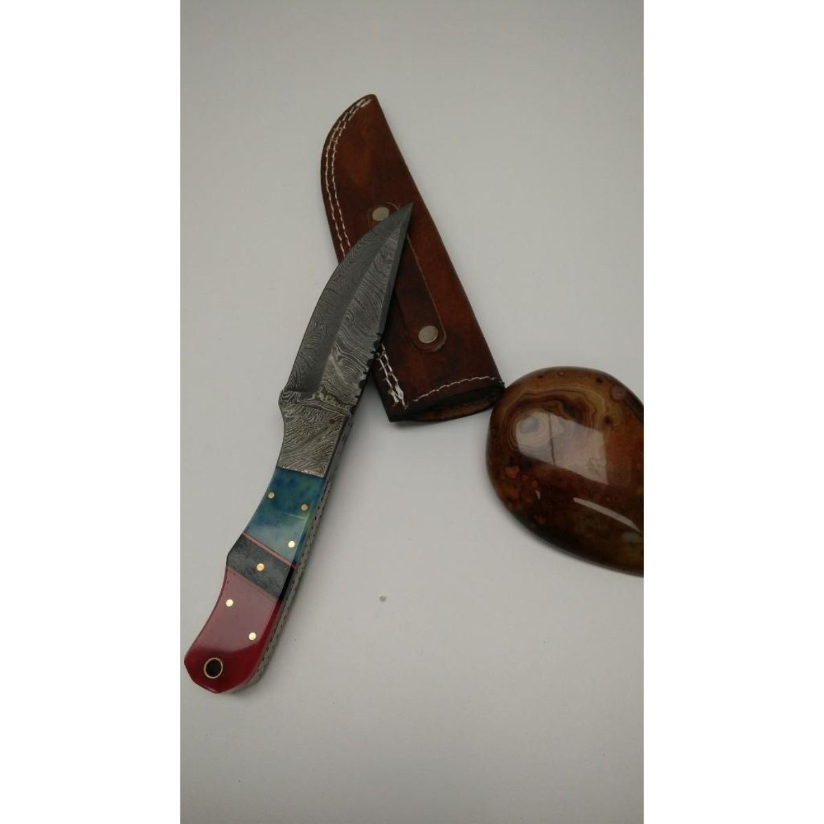 For Auction Is A Stunning Handmade 9" Damascus Straight Back Blade *With Hand Crafted & Hand Stitched Leather Sheath Each blade is created Using 256 Layers Of 1095 and 15N20 High Carbon Steels​​​​​​ To Produce A Superior Edge And Maintain A High Tensile Strength In the Steel. The Handle Is Made Of Select Dymondwood AND Gemstone Composites, Turned And Finished To Produce A Stunning End Quality. Fitted With Brass Rivets and Spacers To Ensure A Fantastic Fit And Finish Damascus Steel Blade with 256 Layers on it. HARDNESS 56-60 H R C Handle: DYMONDWOOD, Gemstone Composite, Ebony Sheath: Hand Crafted Leather
