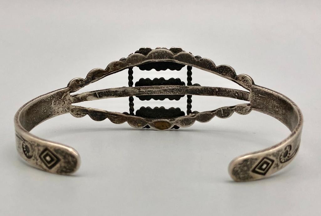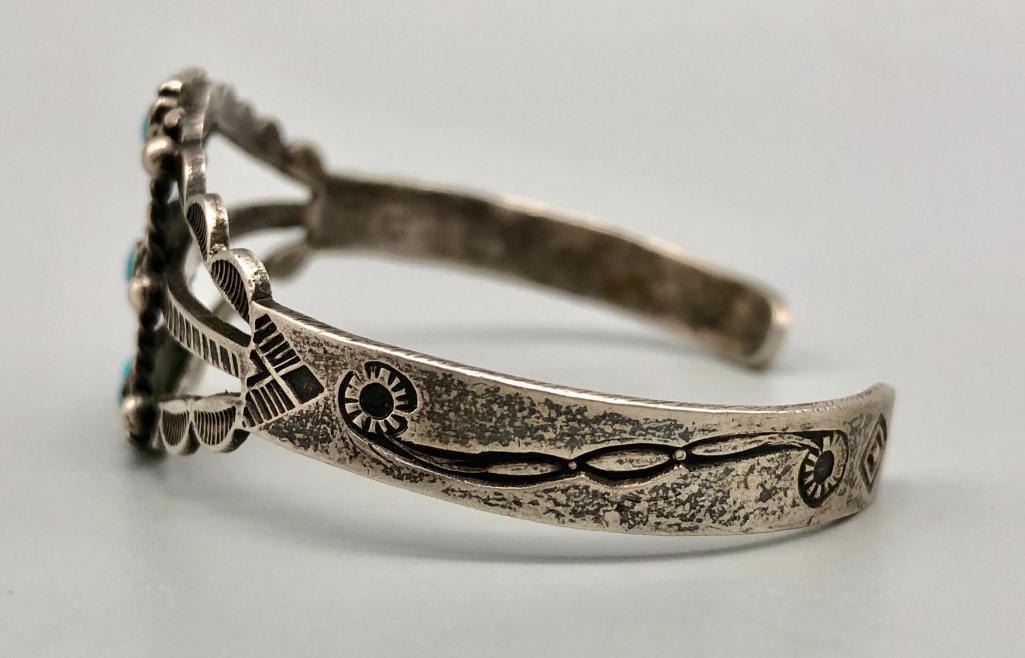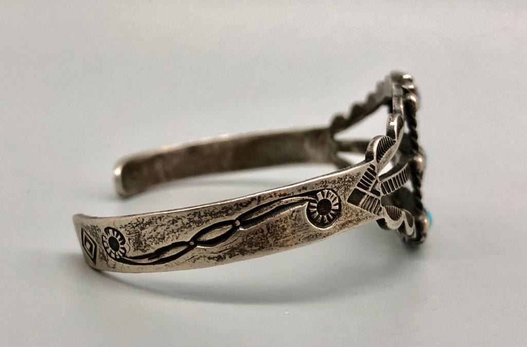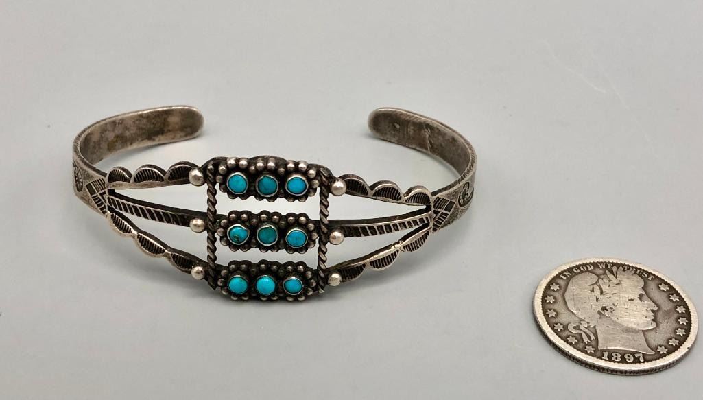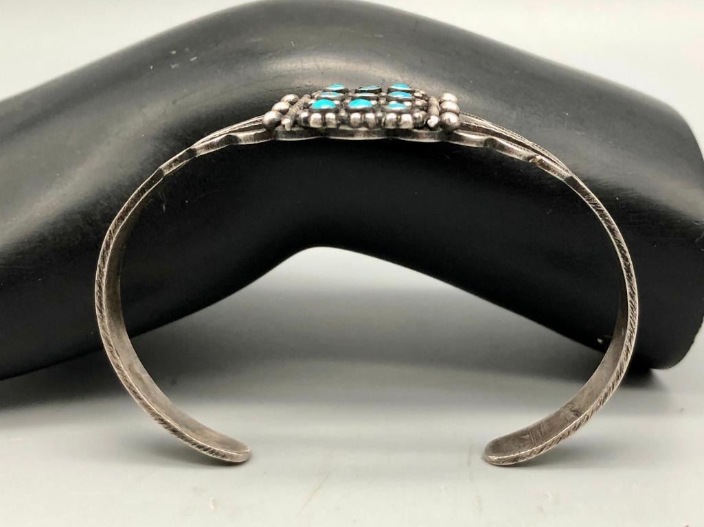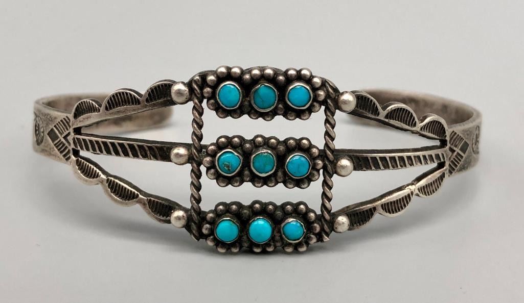 For sale in this lot is a nine turquoise snake eyes ingot bracelet. This is a uniquely designed bracelet that has stamped designs, scalloped edges with a split shank style. In the center it is set with nine turquoise dots or "snake eyes", and fine silver dots. It is made from sterling silver. MAKER: Unmarked. APPROX AGE: Circa 1960s. SIZE: Inside circumference measures 5-1/2 inches long. Opening is an additional 1-1/8 inches, fitting a 6-5/8 inch wrist. Width is 1 inch. Weighs 15.8 grams. CONDITION: Good for its age, normal wear expected. Please look closely at the pictures as they are an important part of our description and are hereby incorporated into the description, specifically with regards to condition. SHIPPING: There will be a $5 handling / packaging fee for shipping this lot. The actual cost of postage will be added on top of that. BUY IT NOW: If you would like to buy this item now, without waiting for the auction day to bid on it, we do offer this option (which is available up to 48 hours before the actual auction starts). The “Buy it Now†price is the high estimate of this lot (plus applicable fees and the Buyer's premium is discounted to 10% when using the Buy it Now option). If you would like to exercise this option, you must contact us by email (or phone as long as you talk to someone live). Reference this lot number and your intention to "Buy it Now."