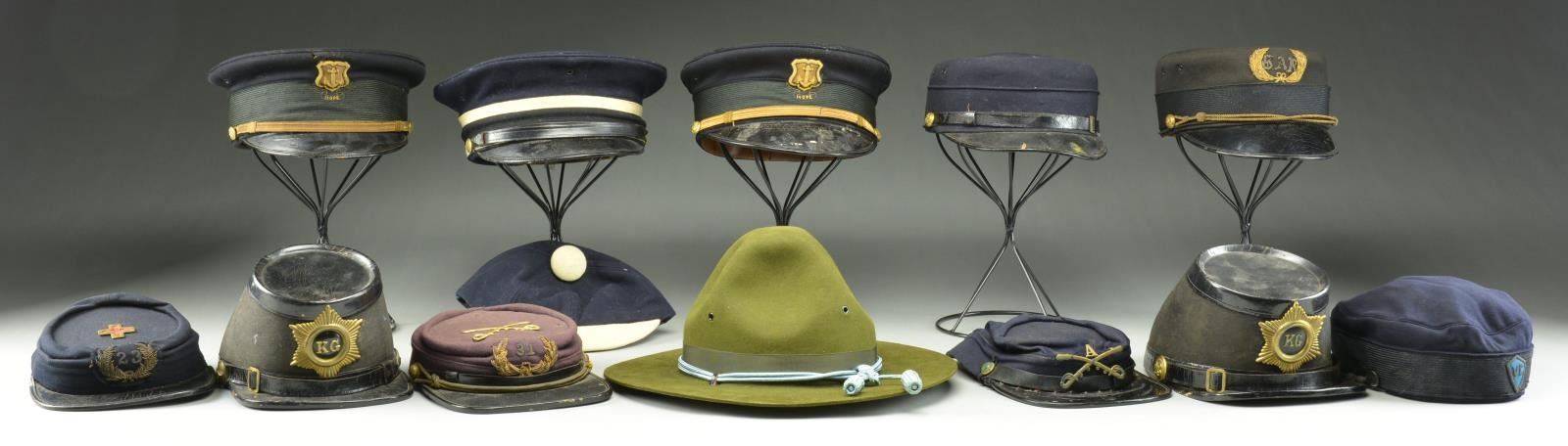 This group consists of 2 M1871 style militia shakos for the Kentish Guard. Each shako has a 6-pointed star on the front with "KG" on the center. / 1 US M1902 visor cap with white & blue band. No cap plate. / 1 Militia pillbox hat with a small blue silver bullion bordered shield on the front baring the letters "VC". / 1 Circa 1900 GAR cap with gold & silver bullion GAR wreath on the front. Black crown with black mohair band. Gilded bullion chinstrap. / 1 Circa 1900 Rhode Island Militia cap with no insignia. Side buttons are of a Rhode Island style. / 1 Late 19th century blue wool kepi with a bullion wreath on the front surrounding the number 23. There is a late brass bordered corps badge for the 1st division of the 6th corps attached to the crown of the kepi. / 1 Indian War era blue wool kepi with small crossed sabers on the front below the letter A. / 1 Late 19th century blue wool kepi with a bullion wreath on the front surrounding the number 31. Crown of the kepi has M1872 crossed sabers attached. / 1 WWII era campaign hat with a light blue hat cord but no other insignia. / 2 M1902 Rhode Island Militia hats with bullion anchor & shield front plate and bullion chinstrap. / 1 College freshman blue & white beanie. CONDITION: generally hats show light to moderate wear. Most wool hats show some degree of moth damage, a few have severe moth damage. (02-18137/BF). $600-900.