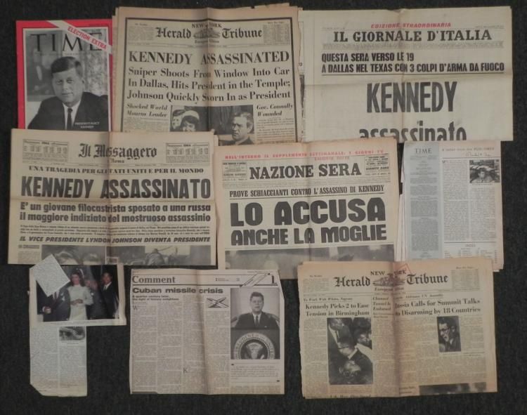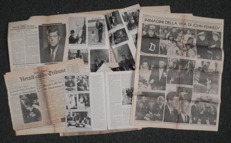FOLDER FULL OF 9 VARIOUS JFK/JACK KENNEDY ASSASSINATION WRITE-UPS IN ITALIAN & ENGLISH * ARTICLES ABOUT JFK--ELECTION TO ASSASSINATION & JACKIE KENNEDY W/ONASSIS *