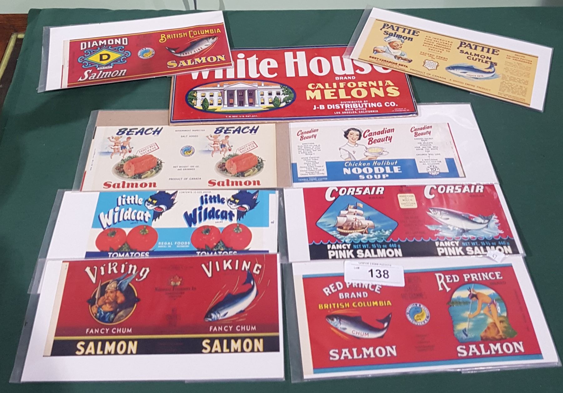 9 VINTAGE UNUSED SALMON & FRUIT LABELS