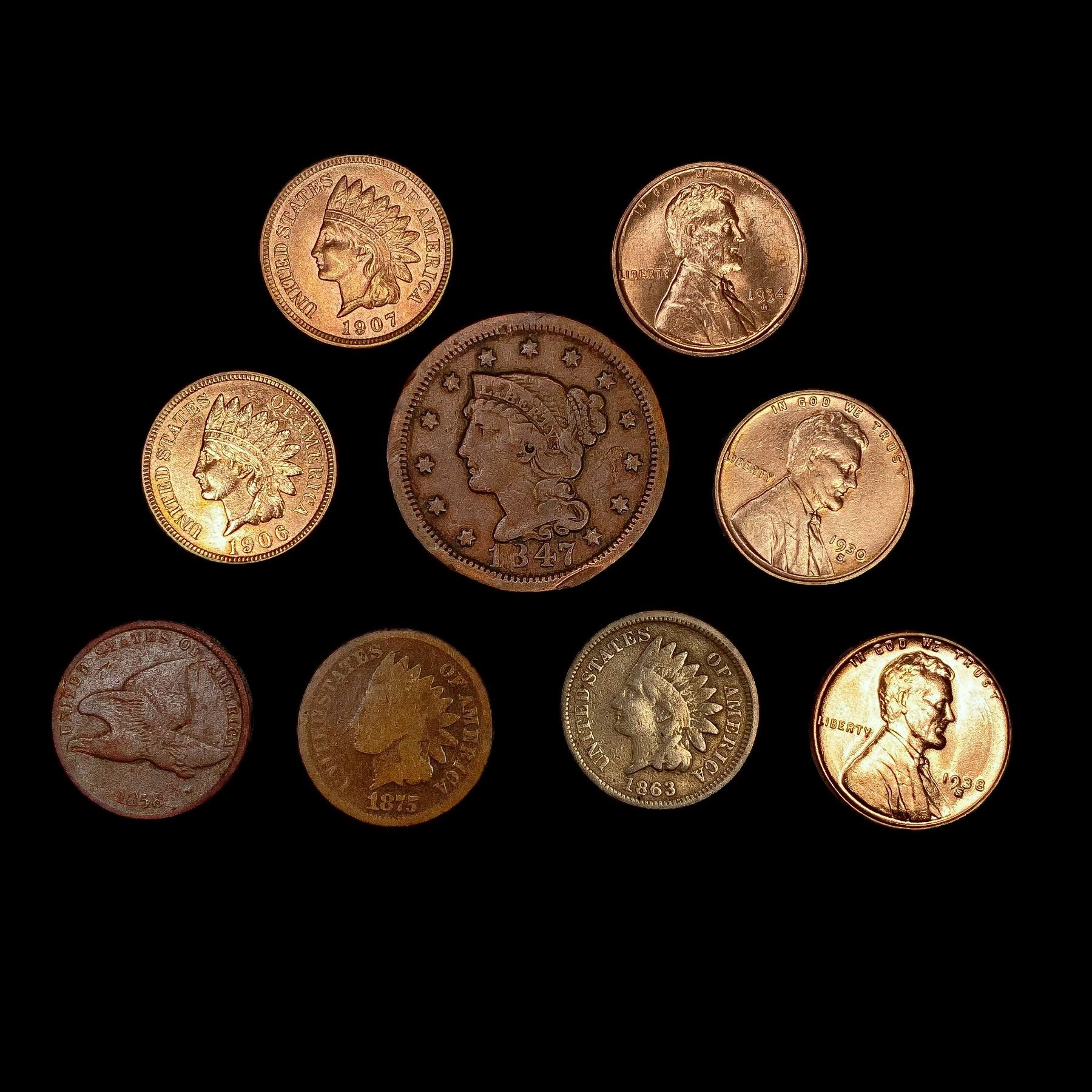 (9) Varied US Cents (1847, 1858, 1863, 1875, 1906,