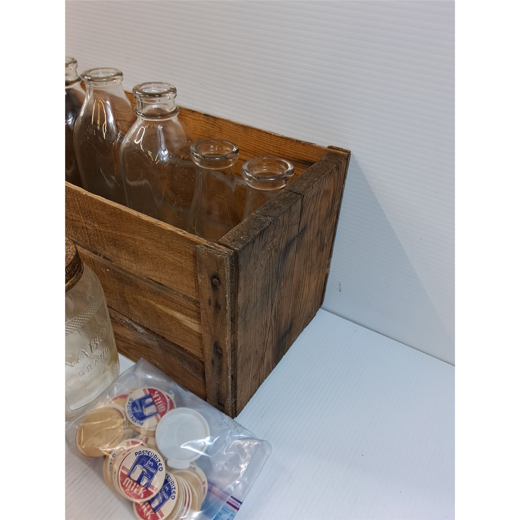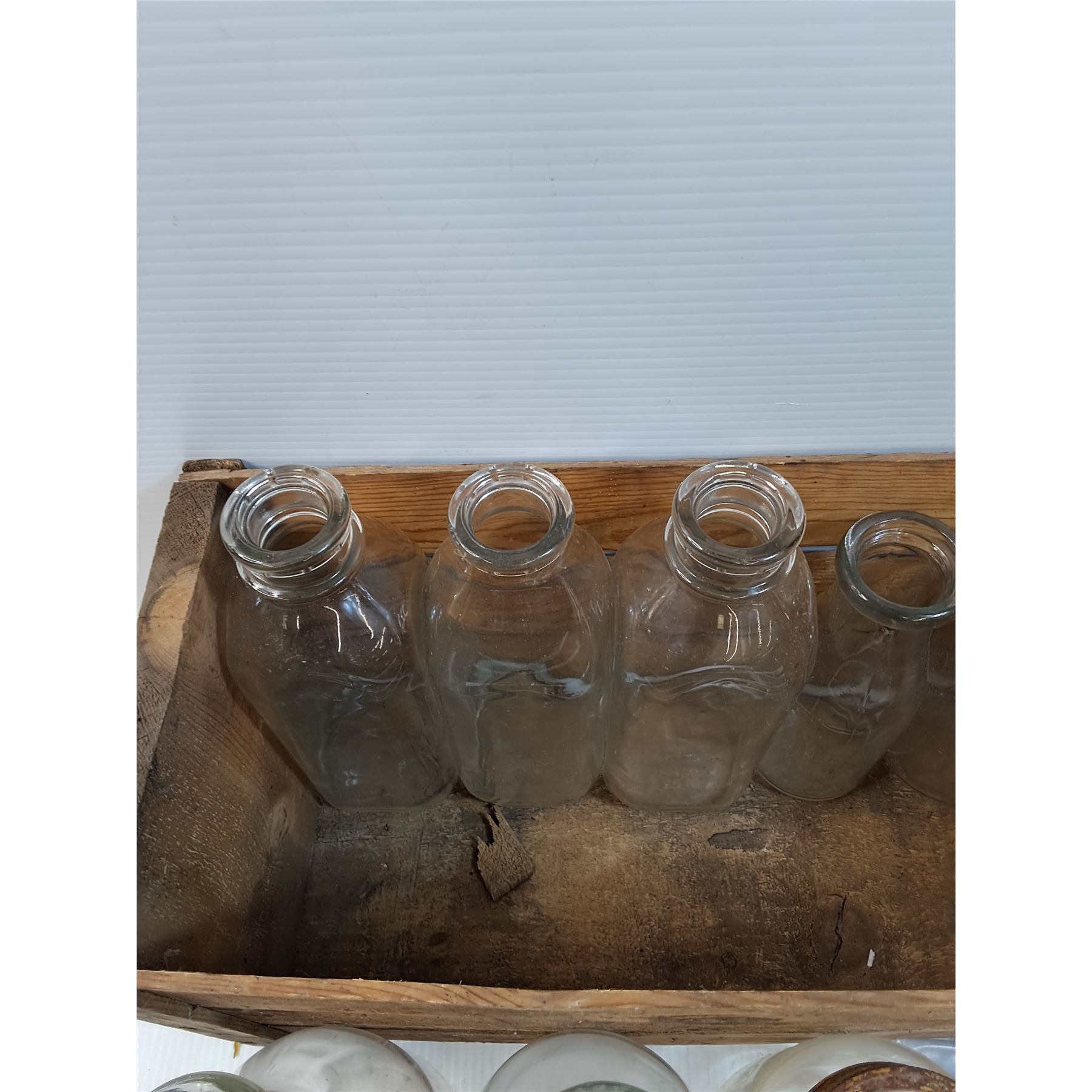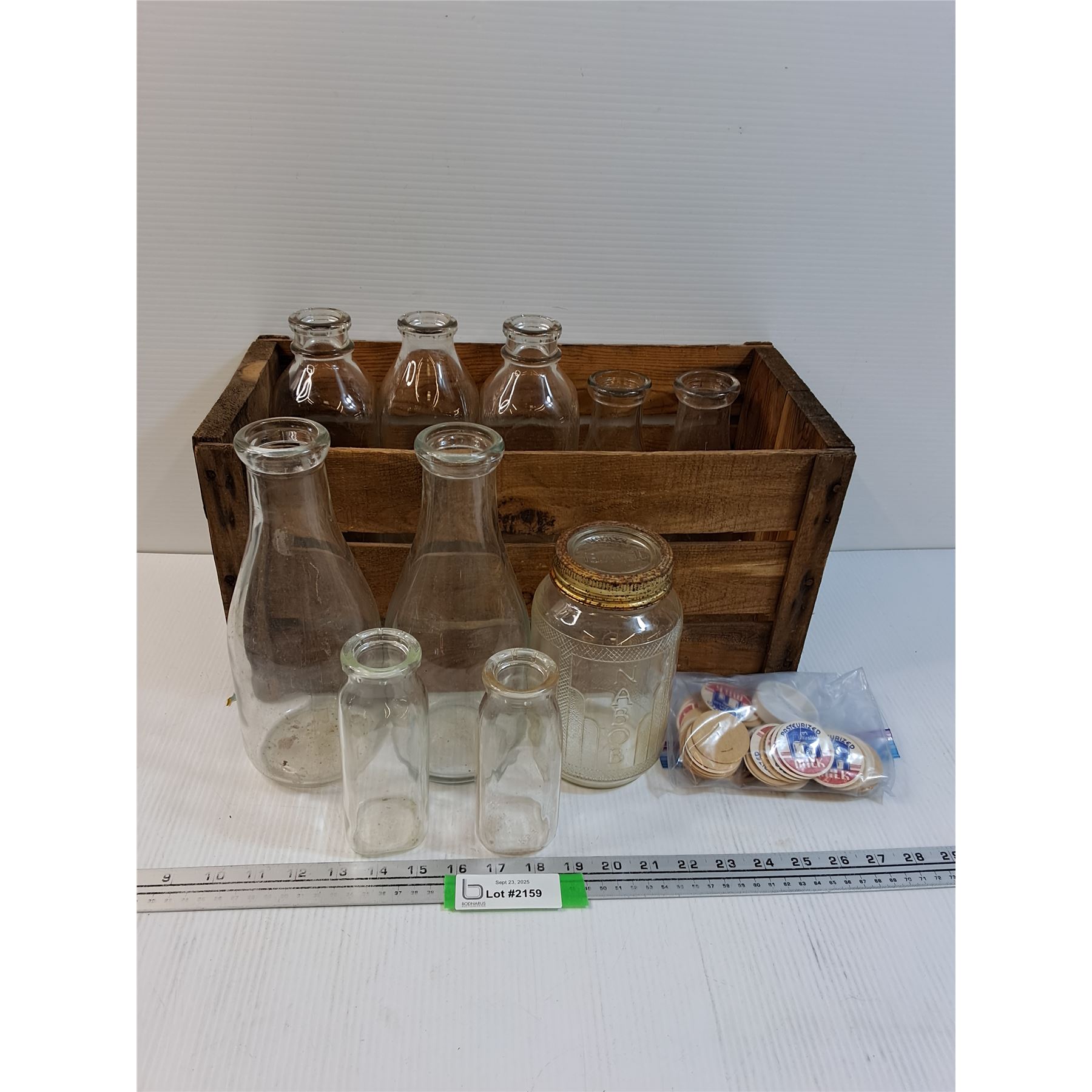 (9) Vintage Milk Glass Bottles - Assorted, Nabob Glass Jar, Wooden Crate, Carboard Milk Toppers