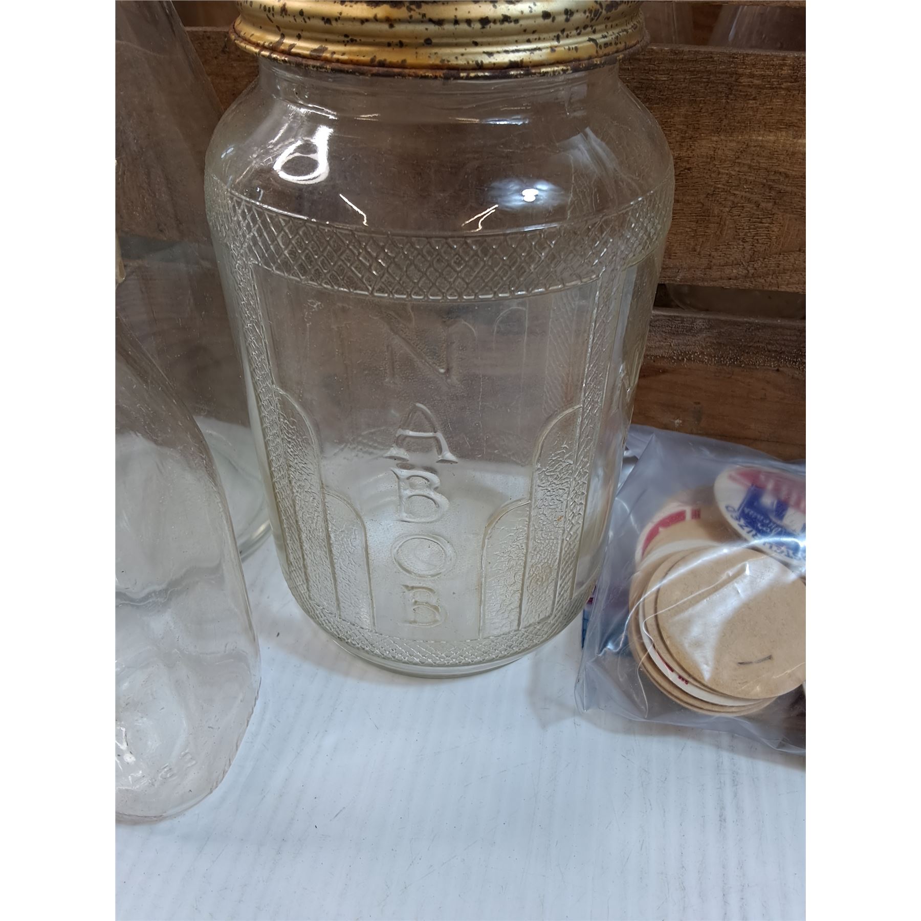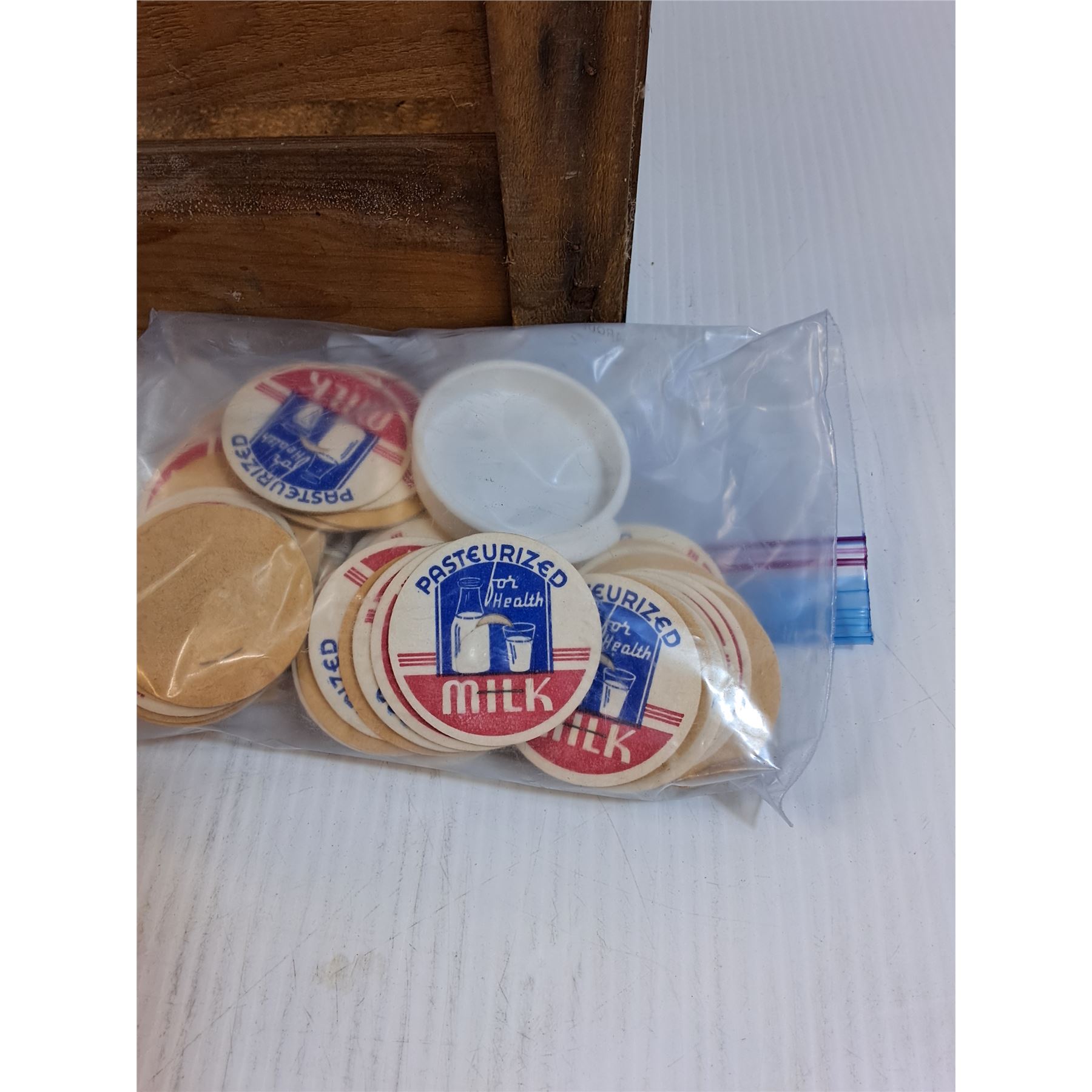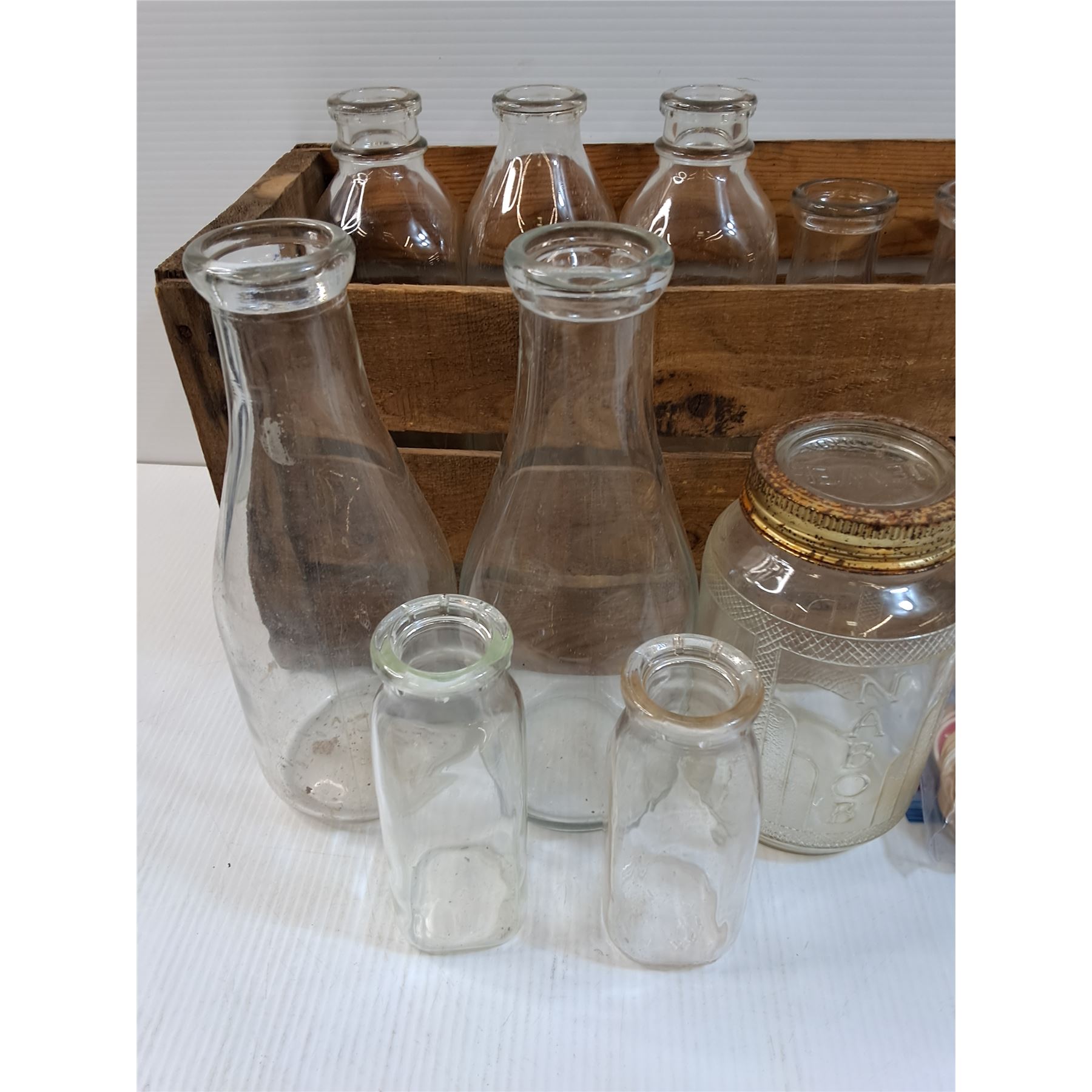 (9) Vintage Milk Glass Bottles - Assorted, Nabob Glass Jar, Wooden Crate, Carboard Milk Toppers