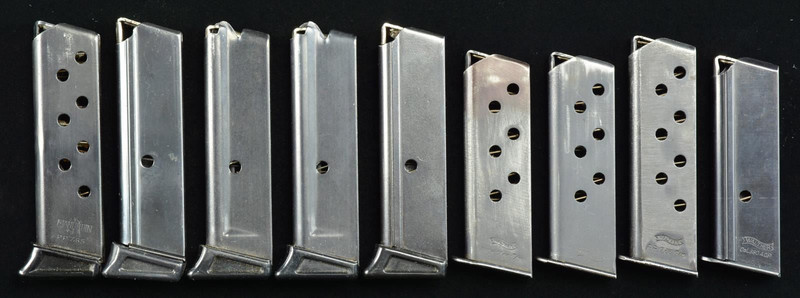 Condition varies from good plus to near excellent. 2 banner (1 additionally w/ "PPK 7,65m/m") 32 ACP PPK 7 rd. flat base mags. w/out side rib. Matte bodies & polished push button bases. / 1 (1944) PP banner & "PP 7,65m/m" marked 8 rd. w/ flat push button base marked "351598" plus "1"; no side rib. / 1 Manurhin PP 8 rd. 32 ACP w/ finger extension; no side rib. / 2 PP 22LR 10 rd. w/ finger extensions. / 1 PPK banner 380 ACP 7 rd. w/ flat push button base & side rib. / 2 Unmarked w/ side ribs PP 8 rd. w/ finger extensions appearing for 32ACP & 380ACP. (02-16951-16/NW). $200-300.