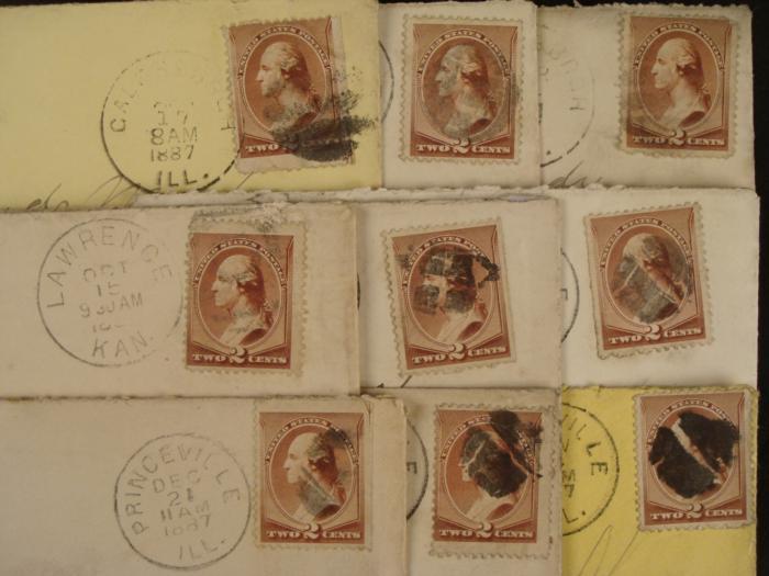 This is a collection of 9 early George Washington 2 Cent stamps, all on envelopes postmark dated from 1887. They are from Galesburgh and Princeville, Illinois, and Lawrence, Kansas. There are a variety of postmarks with grills. All are in plastic sleeves, and in very good condition overall.