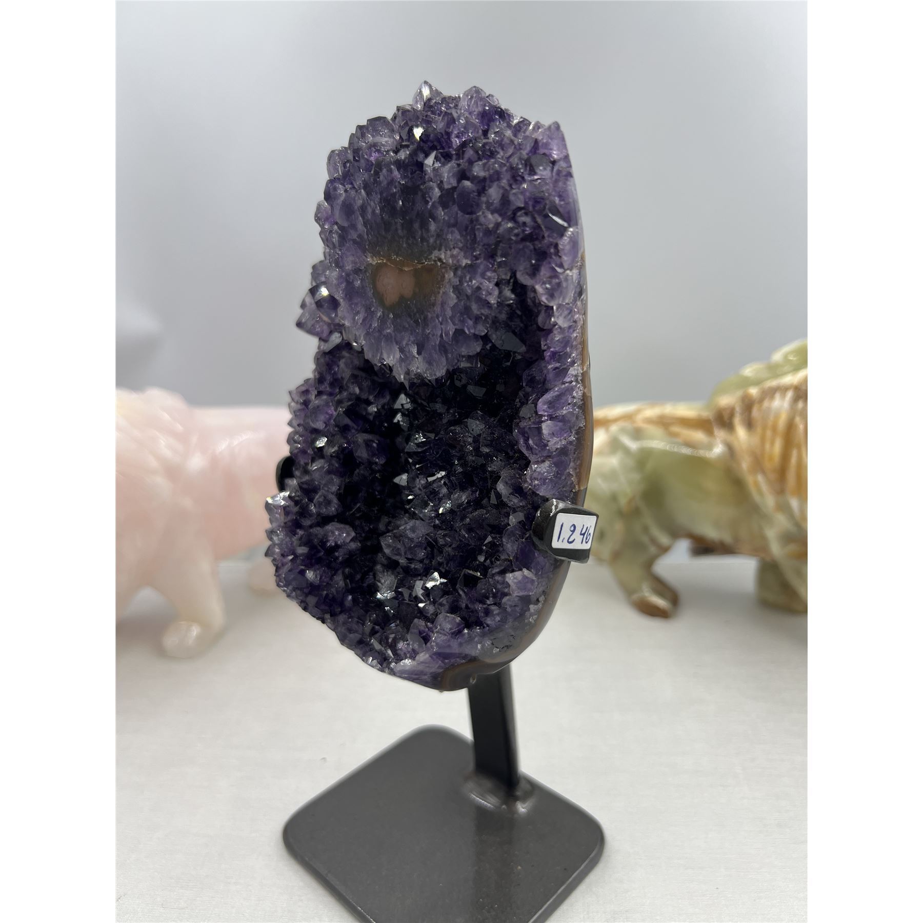 9 X 4 INCH HIGH GRADE URUGYAN AMETHYST CLUSTER ON METAL STAND .