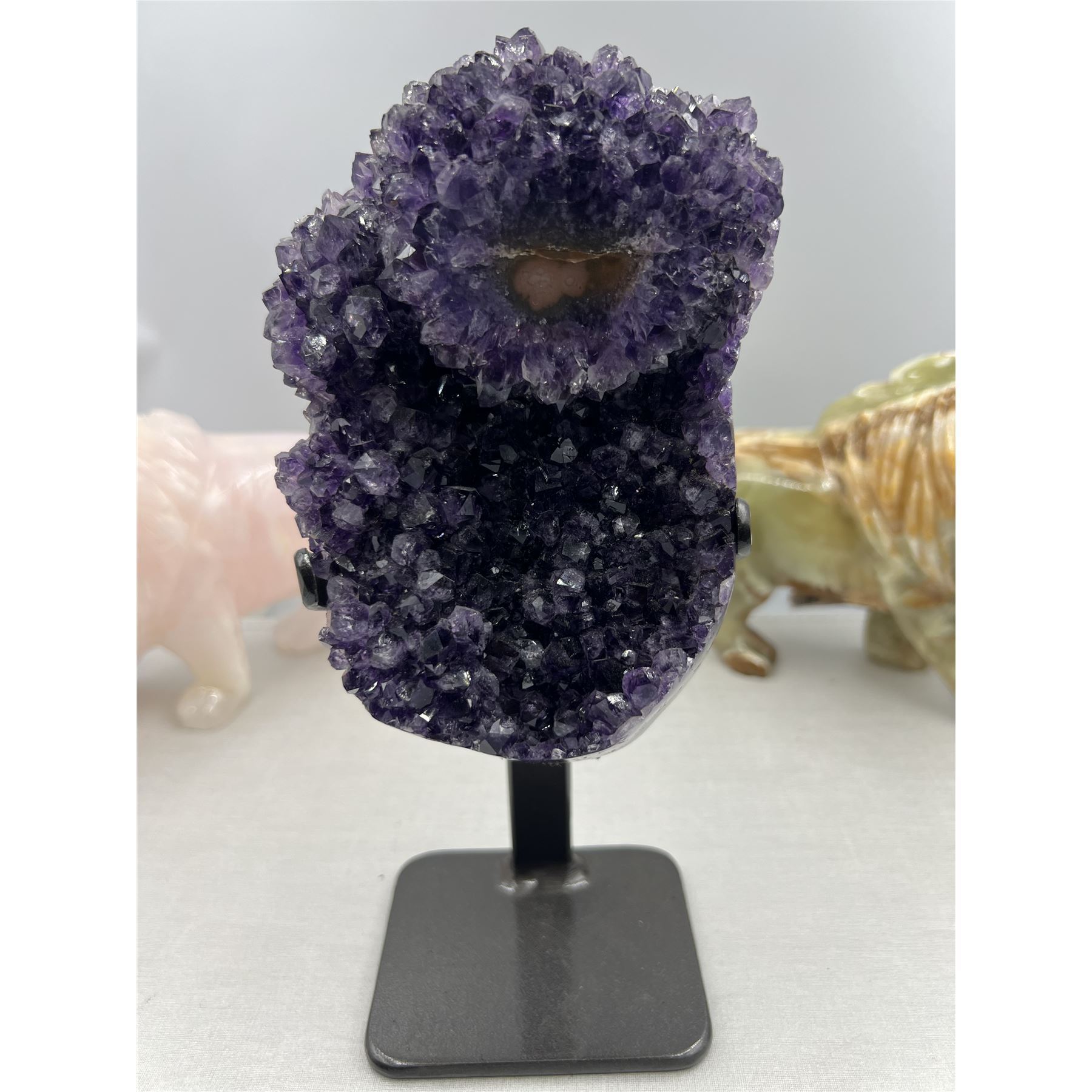 9 X 4 INCH HIGH GRADE URUGYAN AMETHYST CLUSTER ON METAL STAND .