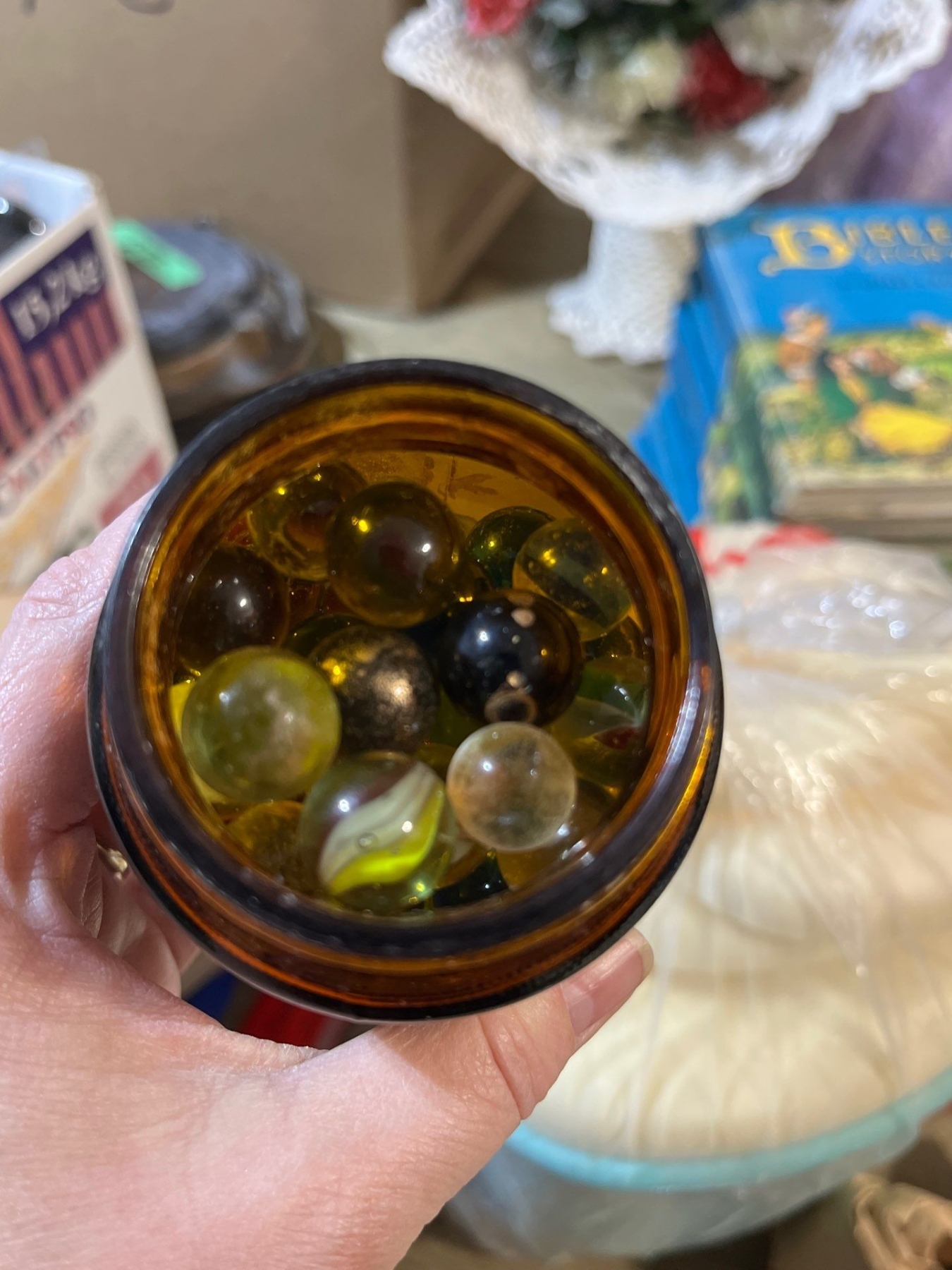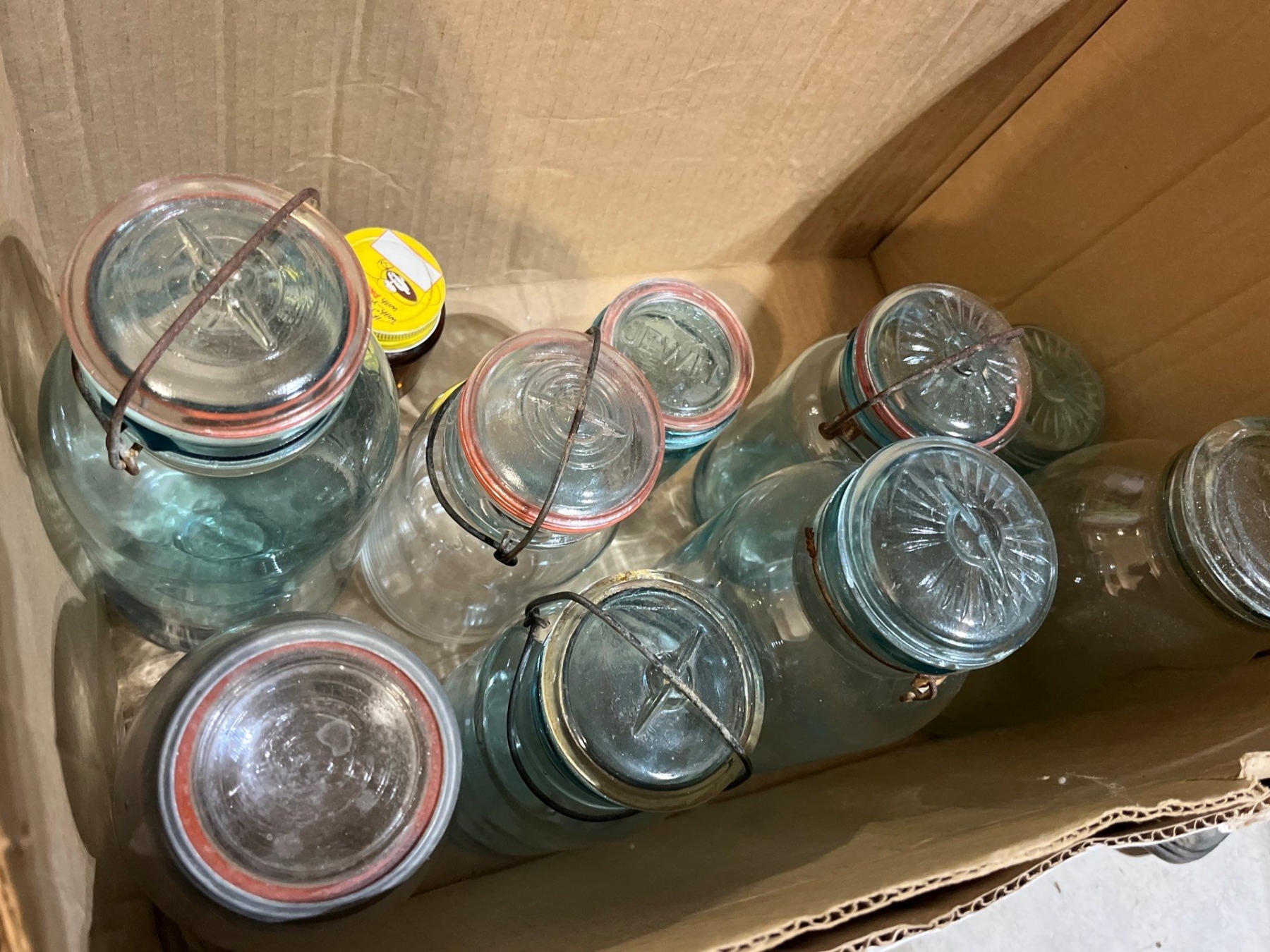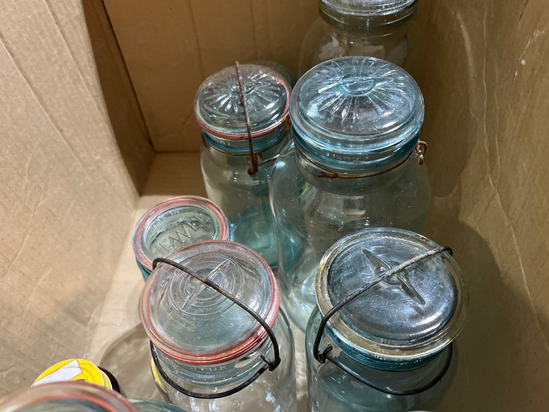 9 blue mason jars all with tops in great condition with a small jar of antique marbles