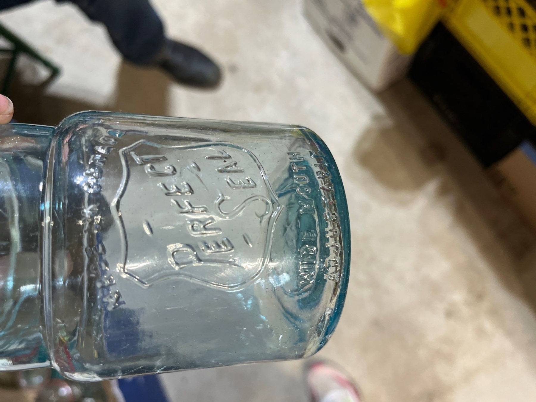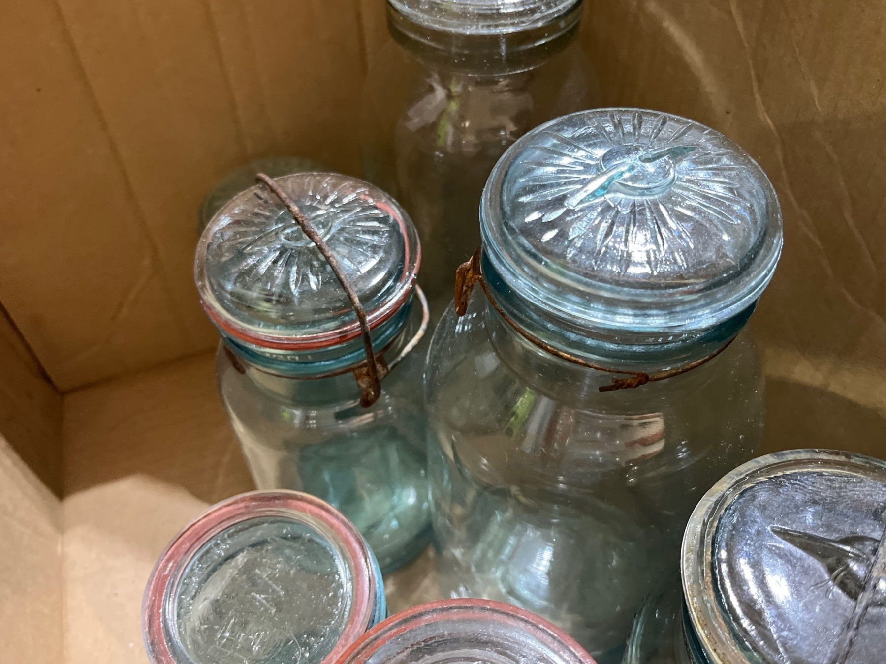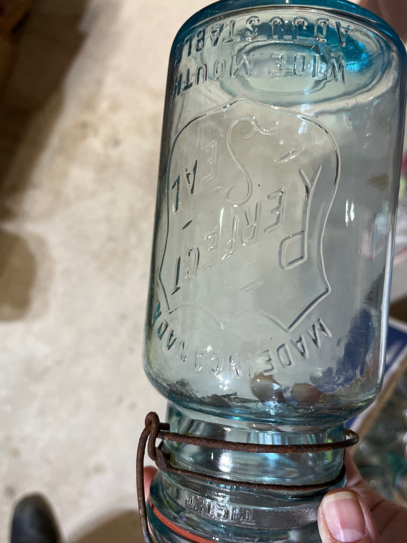9 blue mason jars all with tops in great condition with a small jar of antique marbles