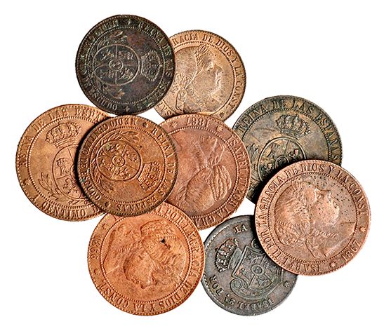 9 monedas de Isabel II: 1/10 de real, 1/2 centimo de escudo (3), céntimo de escudo (5). De MBC a EBC.