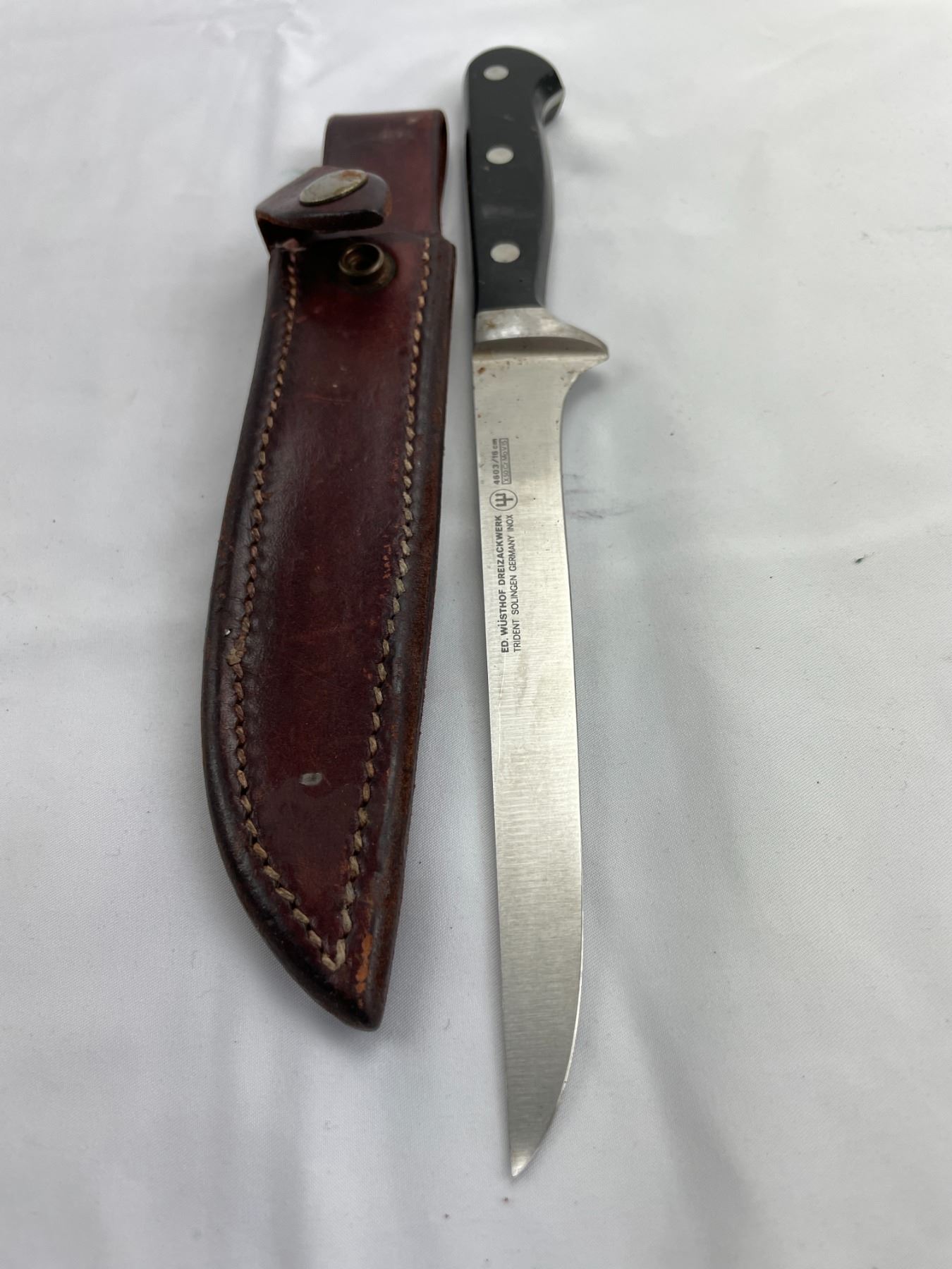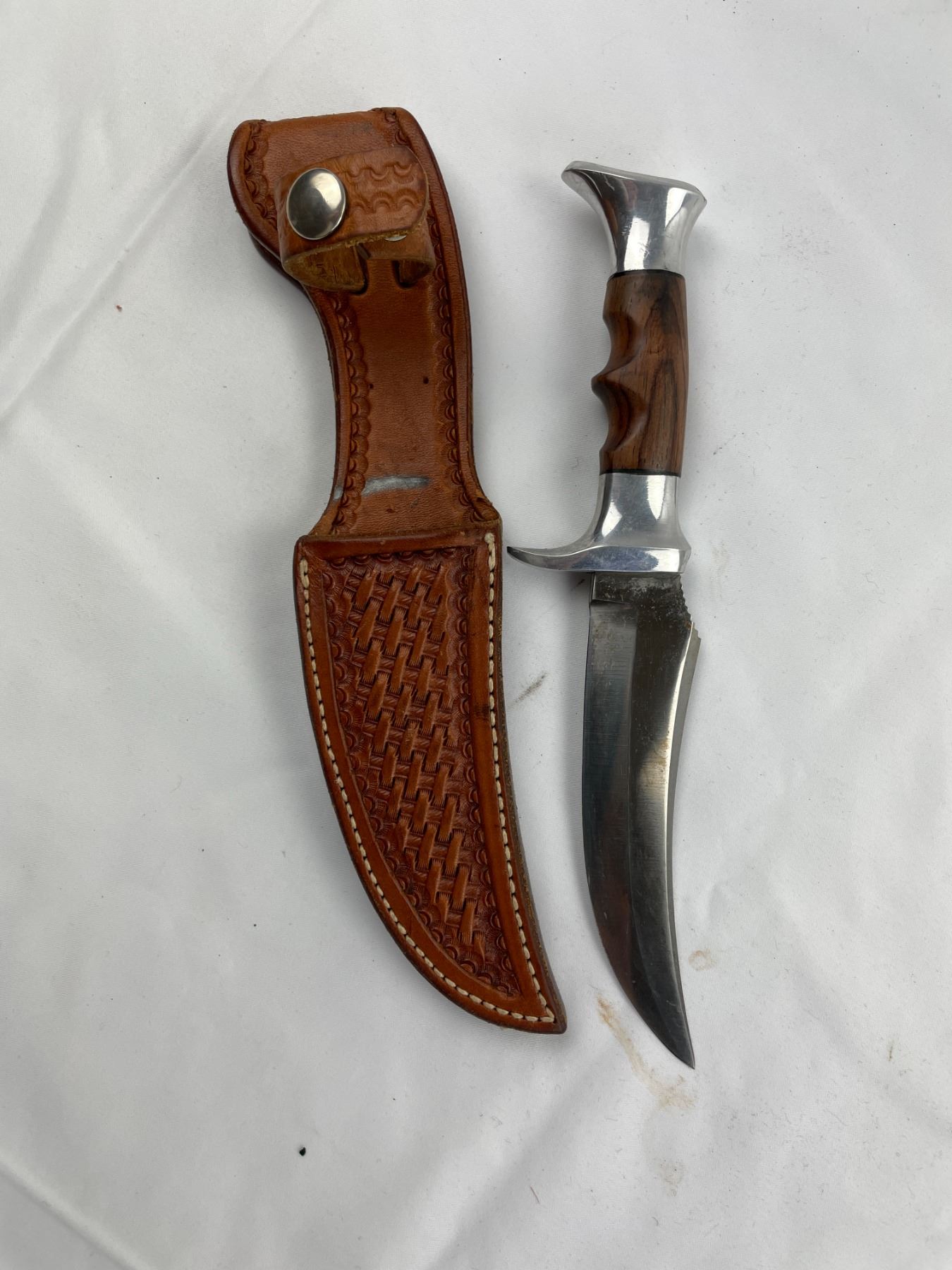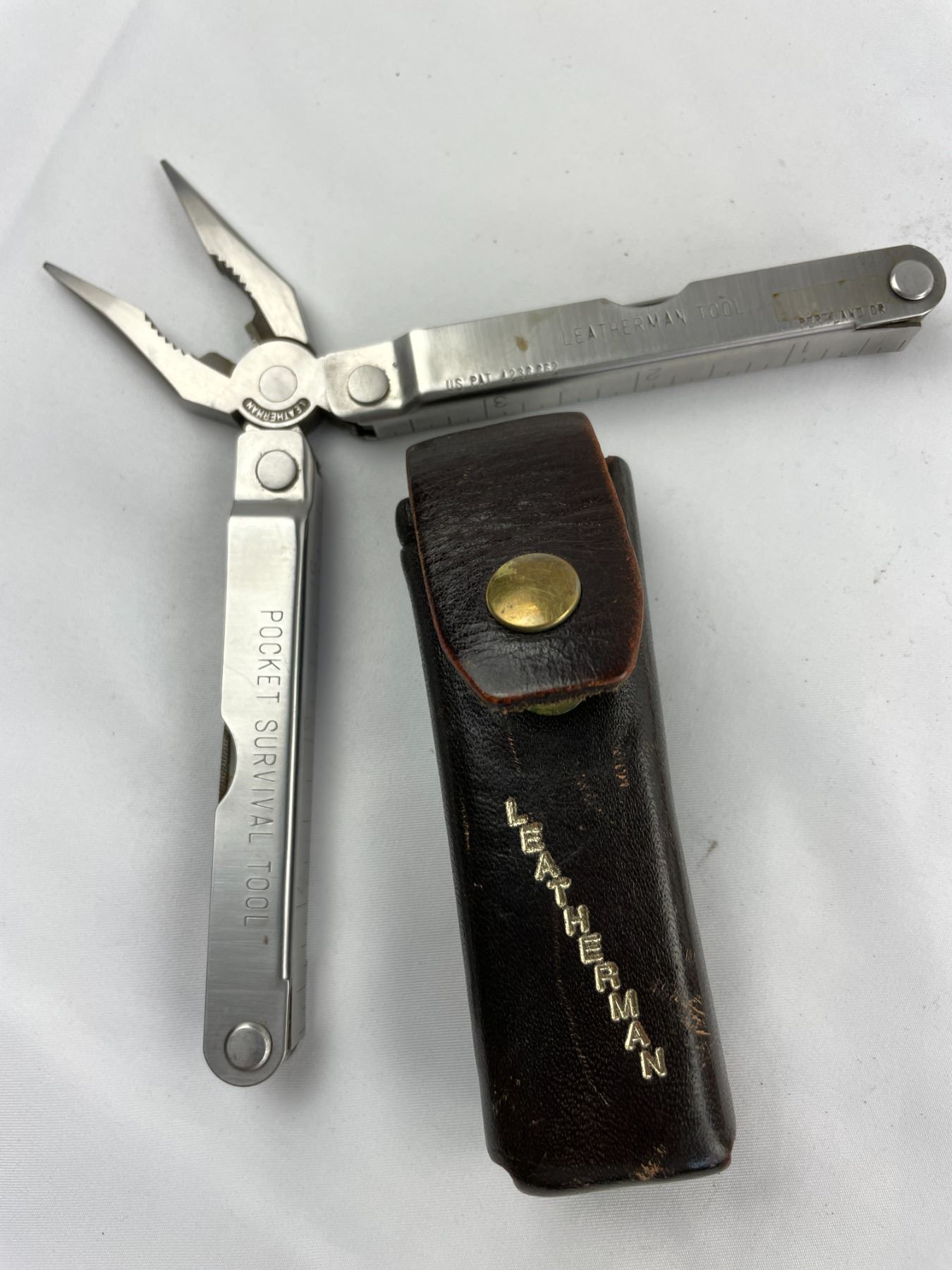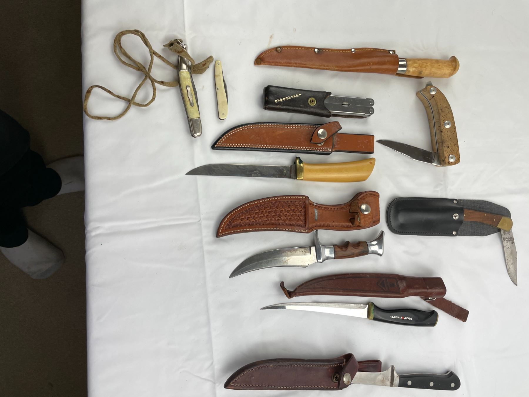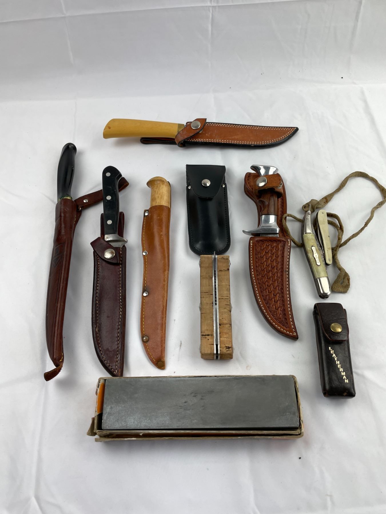 Includes 1 leatherman tool, 8 various knives and 1 sharpening stone.