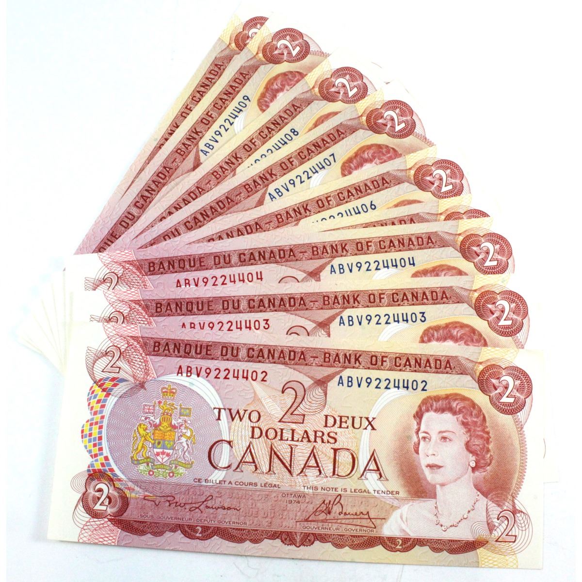 9 x 1974 $2.00 Notes with Consecutive Serial Numbers in UNC condition. Buyers Premium will be added on all items as per our terms of sale. We accept Paypal, Credit Card, E-Transfer Payments, Cheque or Money Orders (there is an additional 3% fee for using Paypal or Credit Card). All invoices will be emailed immediately following the auction, please contact us if you would like to pay by credit card or receive a new revised lower total for mailing in payment or sending an e-transfer (3% discount). All Items Are Sold "AS IS", no returns
