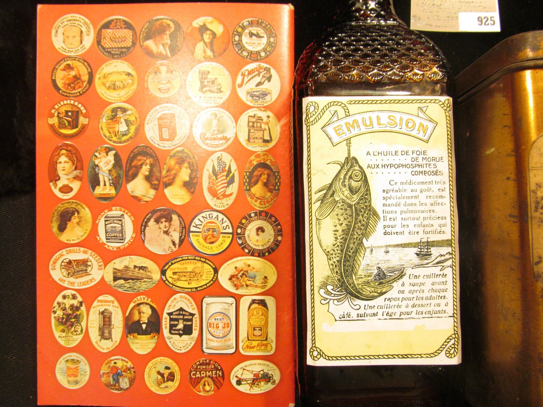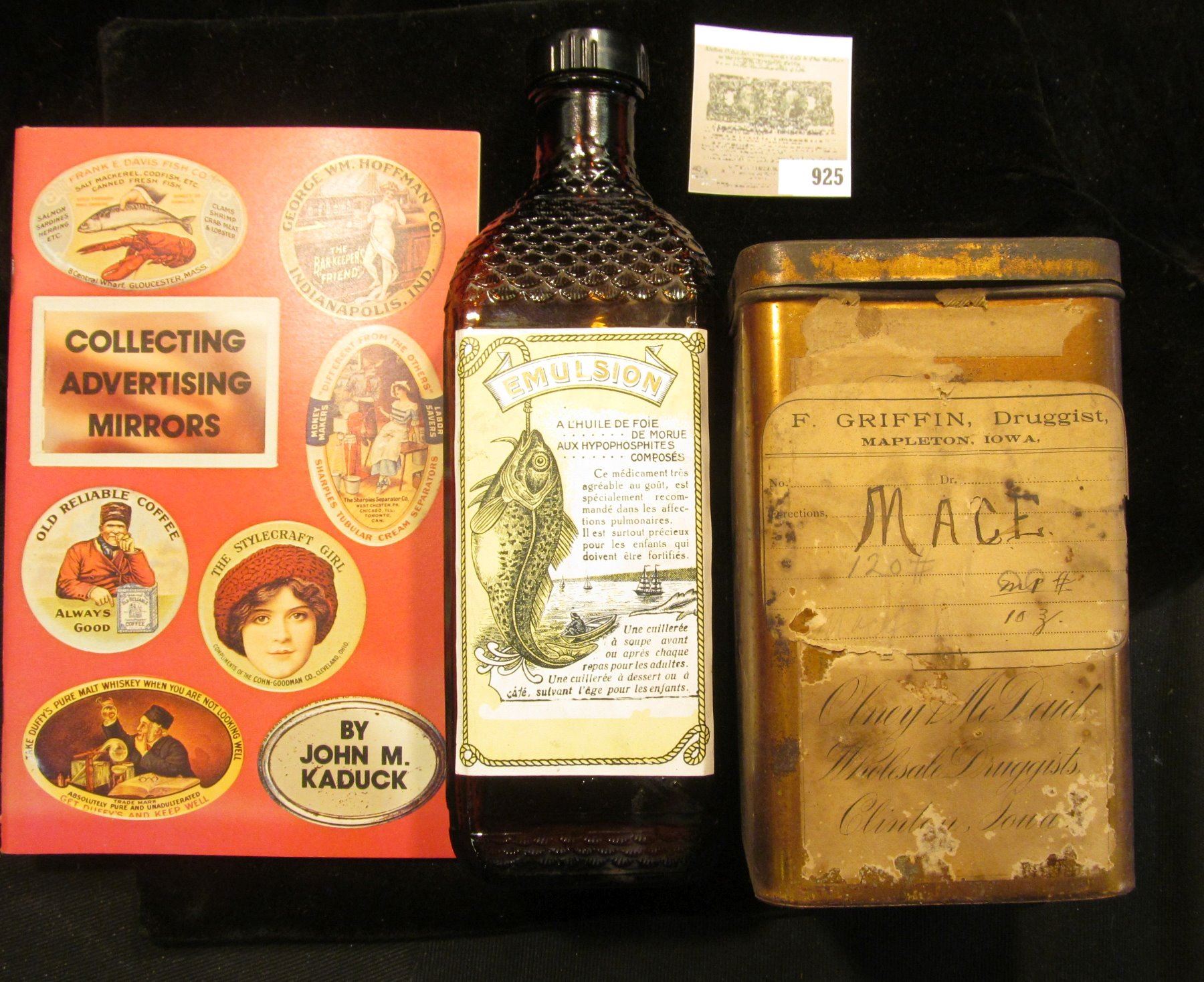 9" x 2" x 2 3/4" Amber Bottle with Fish scale texture and Cod Fish Impression, Label "Emulsion" among other things in French; antique Medicine Tin labeled "Mace...Dr. F. Griffin Druggist Mapleton, Iowa" & "Olney & McDaid Wholesale Druggists Clinton, Iowa" no contents; & 1973 First Edition of "Collecting Advertising Mirros" by John M. Kaduck, 56 pgs.