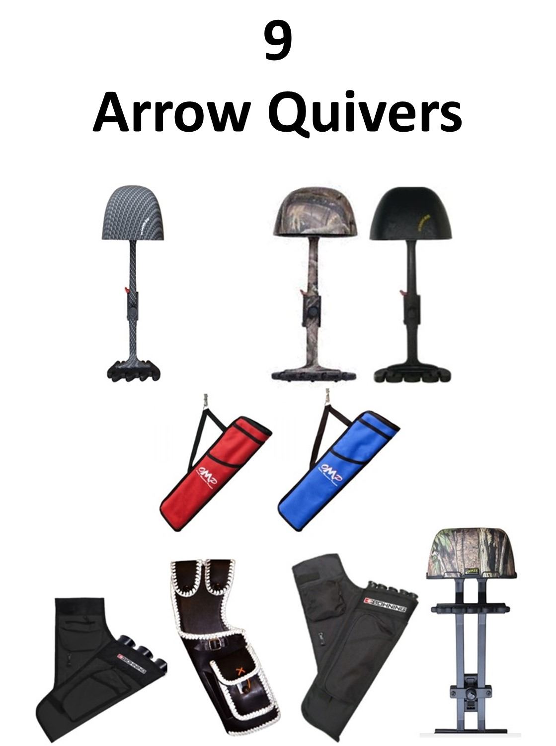 9 x Arrow Quivers, 4 x Kwikee Kwiver, 1-3 Arrow Carbon, 1-4 Arrow Lost AT, 1-4 Lite Black, 1-HI-5 Infinity Mossy Oak, 2 x OMP 3 Tube Quivers, 1-Red, 1-Blue, 2 x Bohning, 1-Mini Target Black RH, 1-Target Black RH, 1 x Vista Rascal Black RH