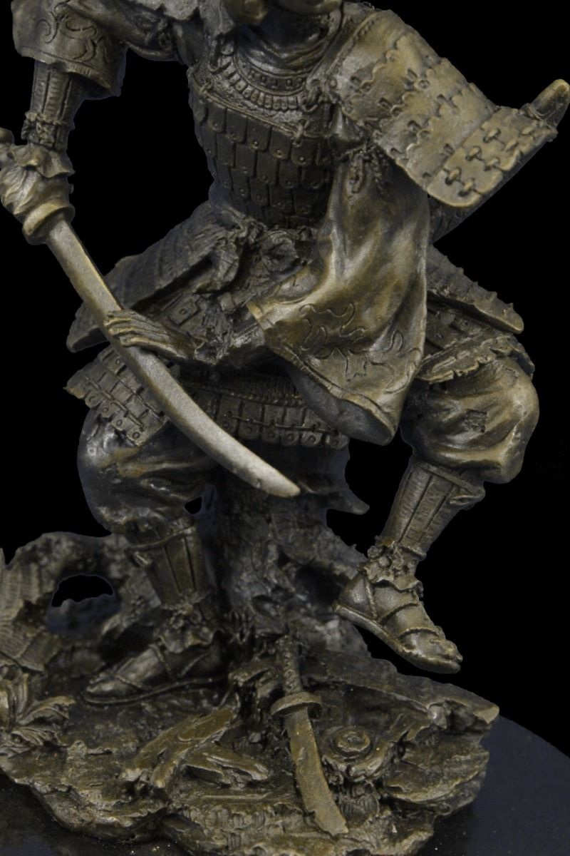 11DS08980 This samurai is dressed in head to toe armor for his own protection. He is not afraid at all, since that was the first rule of their army. He runs to the front of battle and without a care he kills a man with his long sword, stabbing him from underneath while he wasn't looking. He bends his knee to make sure he had the right pose to mark the best spot. This sculpture was cast using the ancient old "Lost Wax Method" stained in brown patina finish for preservation. 100% handmade and 100% bronze mounted atop a black marble base and is signed by artist Kamiko...................SHIPPING USA: $20....HI, ALASKA, CANADA: $40...ALL OTHER COUNTRIES: $79