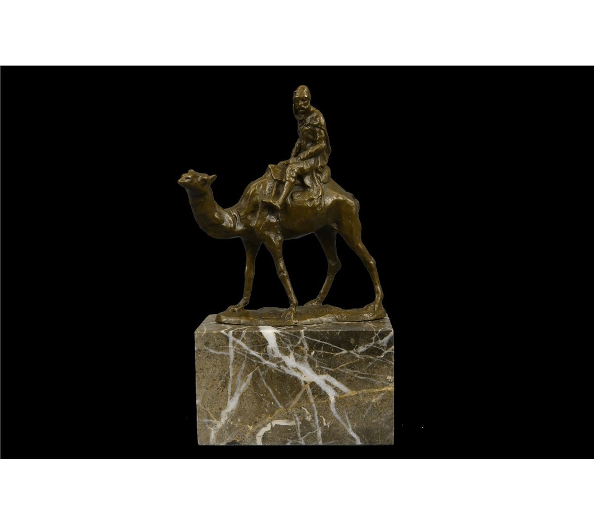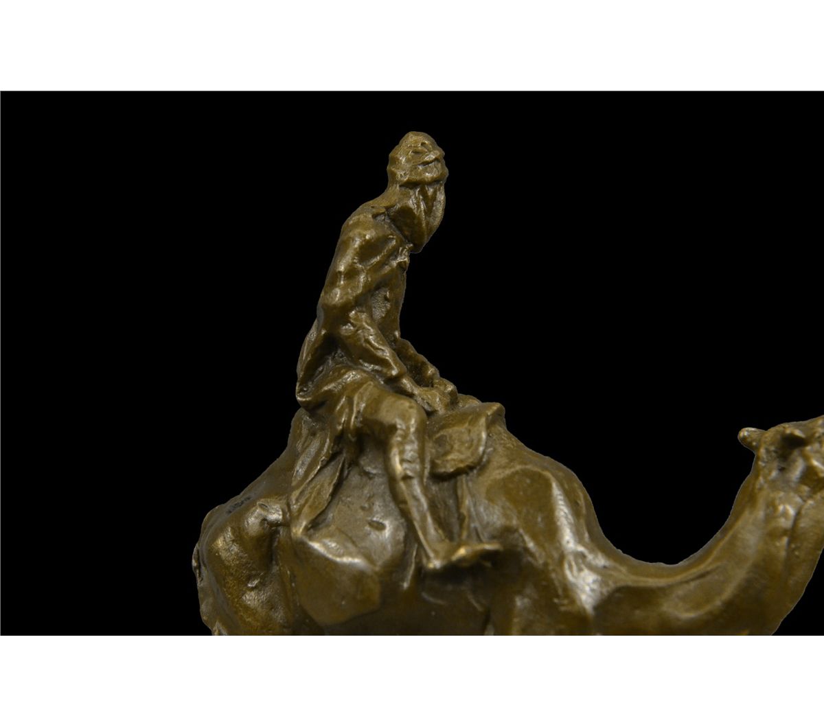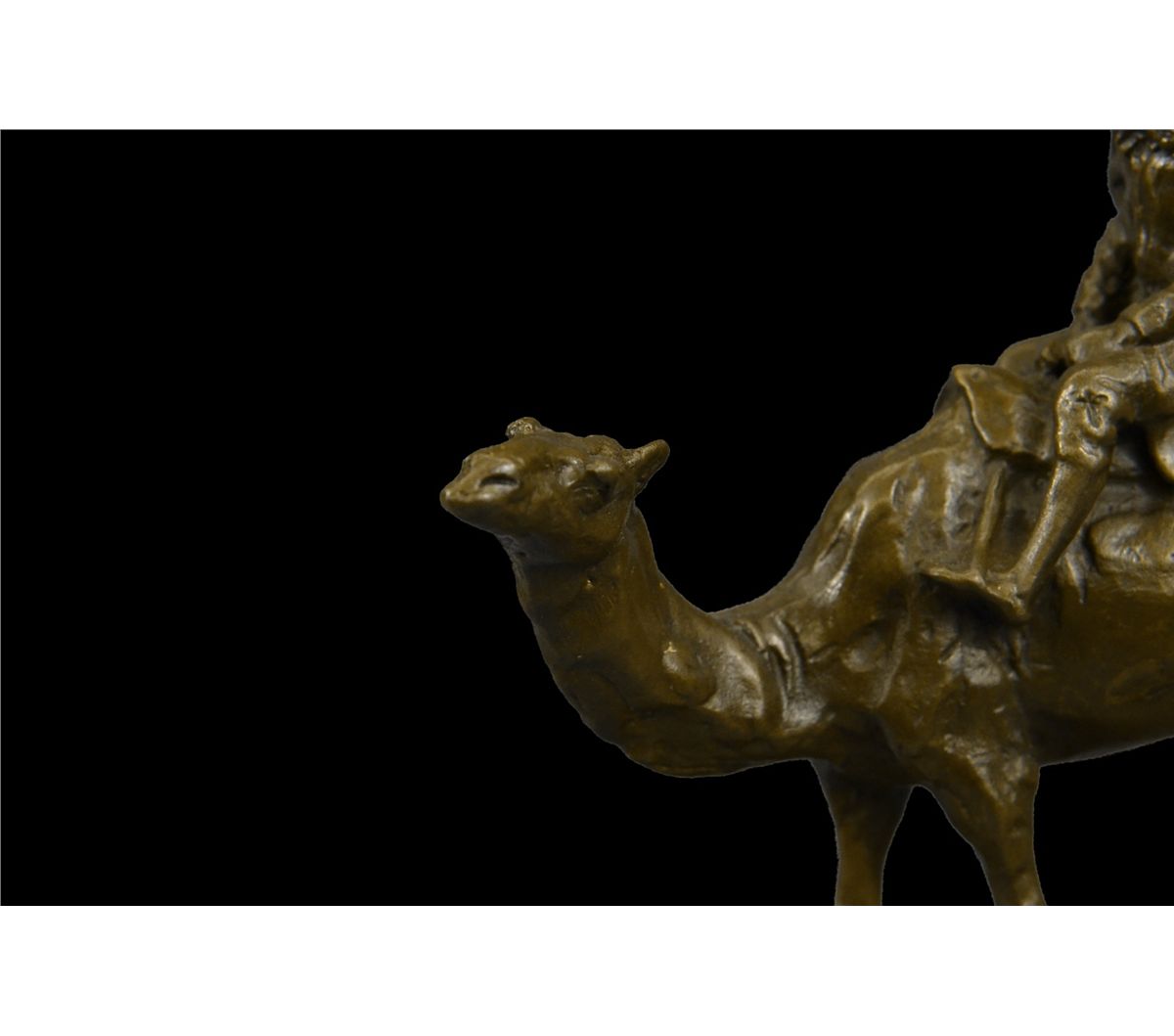 11XNCH58380 After Years Of Traveling The Desert With His Faithful Camel The Two Of Them Are Inseparable. The Camel Does Not Mind One Bit That His Owner Is Perched On Top Of Him As He Takes A Rest. The Camel Is Saddled Up And Has An Intricate Blanket Draped Over The Top Of Him. His Owner Sits On Top Of Him And Crosses His Legs Which He Rests One Of His Arms On. He Takes Off One Of His Sleeves And Lets His Body Get Some Fresh Air. This Bronze Sculpture Has A Lot Of Miniscule Details, So Every Time You Look At The Sculpture You Will Find Something New. This Bronze Sculpture Was Cast Using The “Lost Wax Method” And Has A Brown Patina. It Is Mounted On A Marble Base And Is Handmade And Is Signed Bergman...................SHIPPING USA: $17....HI, ALASKA, CANADA: $35...ALL OTHER COUNTRIES: $69