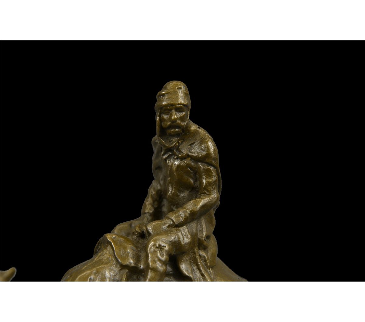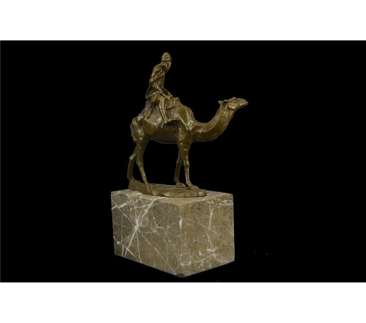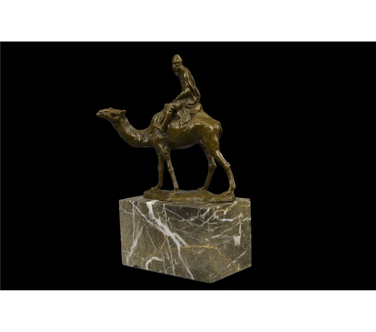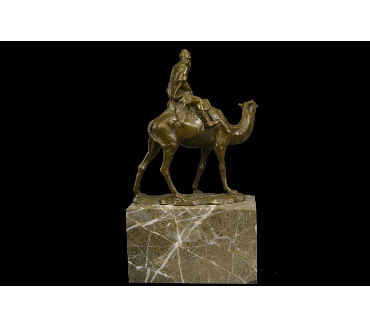 11XNCH58380 After Years Of Traveling The Desert With His Faithful Camel The Two Of Them Are Inseparable. The Camel Does Not Mind One Bit That His Owner Is Perched On Top Of Him As He Takes A Rest. The Camel Is Saddled Up And Has An Intricate Blanket Draped Over The Top Of Him. His Owner Sits On Top Of Him And Crosses His Legs Which He Rests One Of His Arms On. He Takes Off One Of His Sleeves And Lets His Body Get Some Fresh Air. This Bronze Sculpture Has A Lot Of Miniscule Details, So Every Time You Look At The Sculpture You Will Find Something New. This Bronze Sculpture Was Cast Using The “Lost Wax Method” And Has A Brown Patina. It Is Mounted On A Marble Base And Is Handmade And Is Signed Bergman...................SHIPPING USA: $17....HI, ALASKA, CANADA: $35...ALL OTHER COUNTRIES: $69