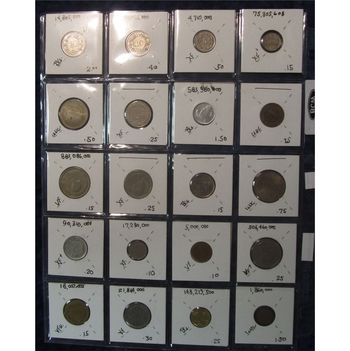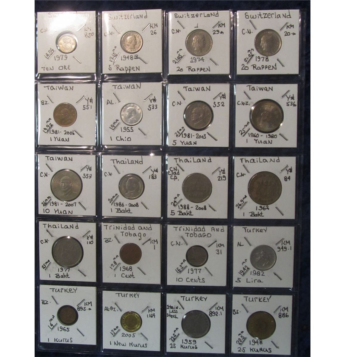 90. (20) World Coins in a Plastic Page identified with KM No., Metal size, & etc. All different. Includes: Sweden, Switzerland, Taiwan, Thailand, Trinidad & tobago, & Turkey. KM Value on this group is $9.70.