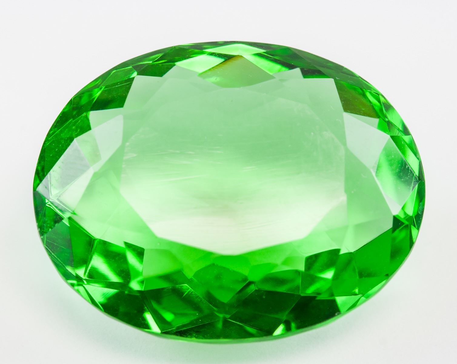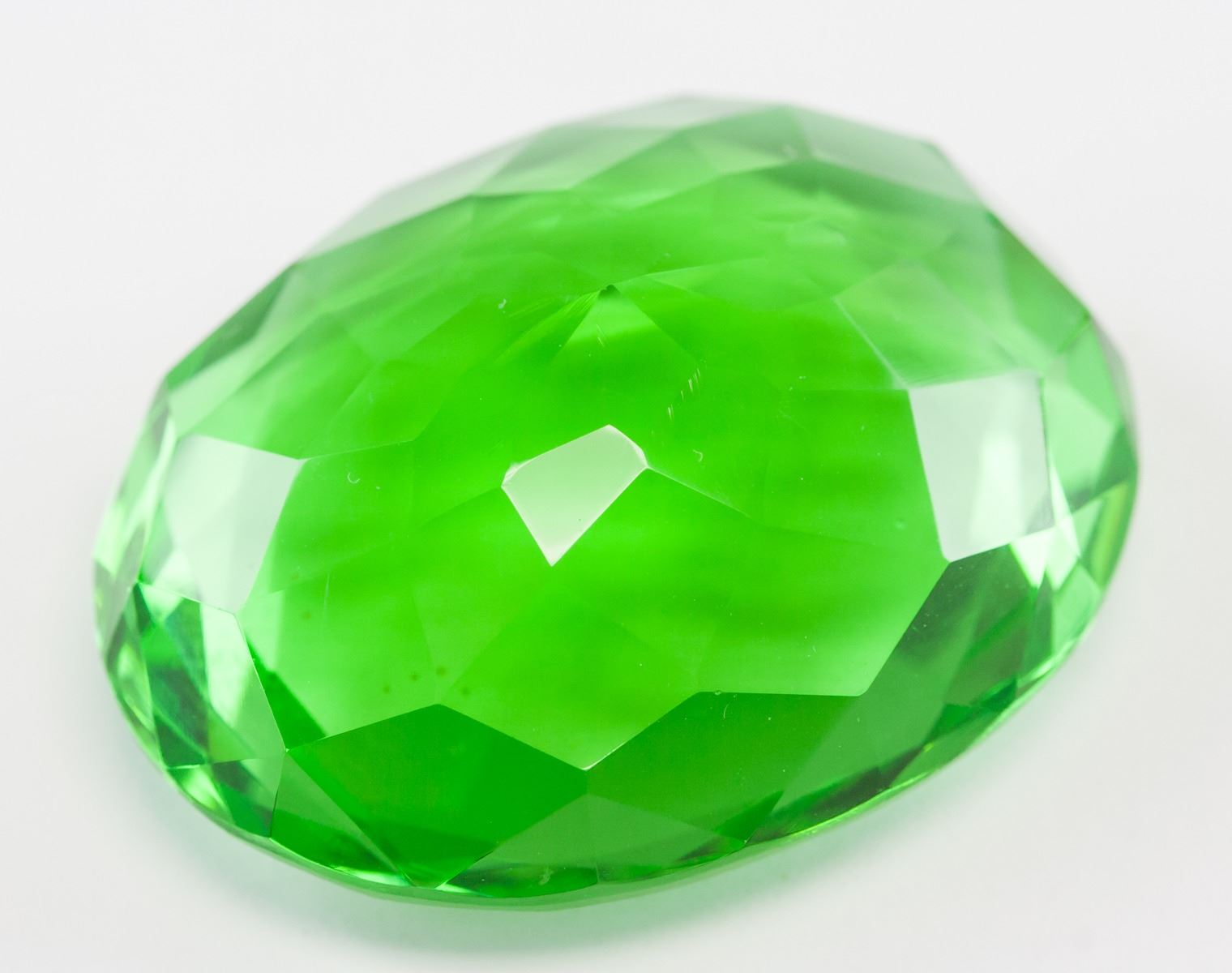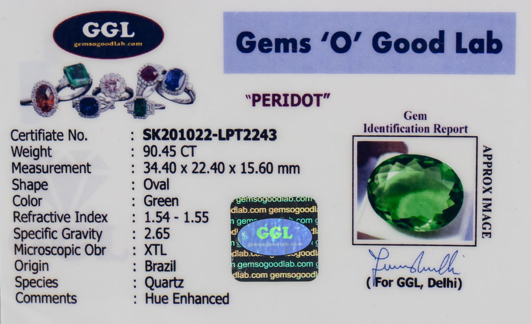 One (1) 90.45 ct oval cut green peridot. Origin: Brazil. Accompanied with GGL certificate. 34.40 x 22.40 x 15.60 mm.