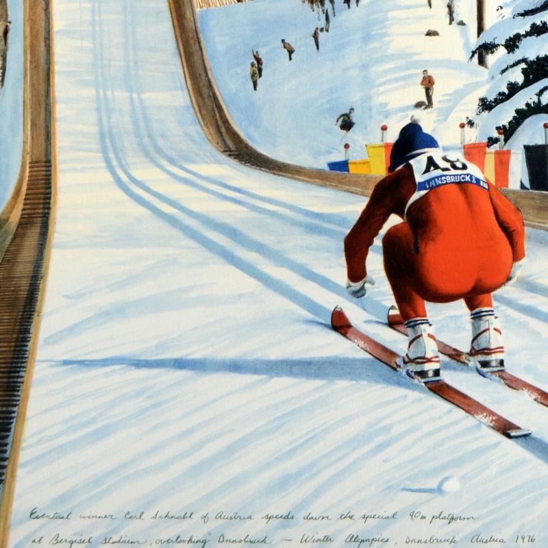 "90-Meter Ski Jump" is a limited edition serigraph on paper by William Nelson, numbered and hand signed by the artist! Measures approx. 22" x 29" (with border); 19" x 26" (image).