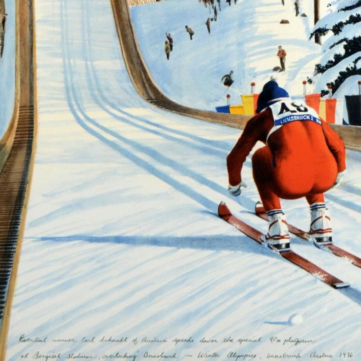 "90-Meter Ski Jump" is a limited edition serigraph on paper by William Nelson, numbered and hand signed by the artist! Measures approx. 22" x 29" (with border); 19" x 26" (image).